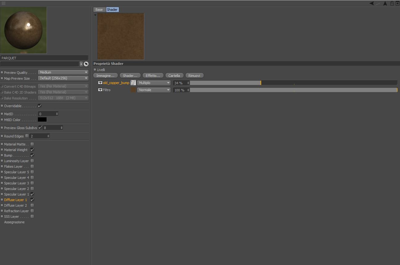 Quello che volevo era un parquet "sporco", o meglio vissuto, con qualche macchia e magari qualche segno o graffio e quindi ho sovrapposto alla texture originale nel canale Diffuse, un'imagine in scala di grigio rappresentante delle macchie e graffi in modalità "multiplo" grazie a l'opzione "livello" e con un'opacità del 34%.