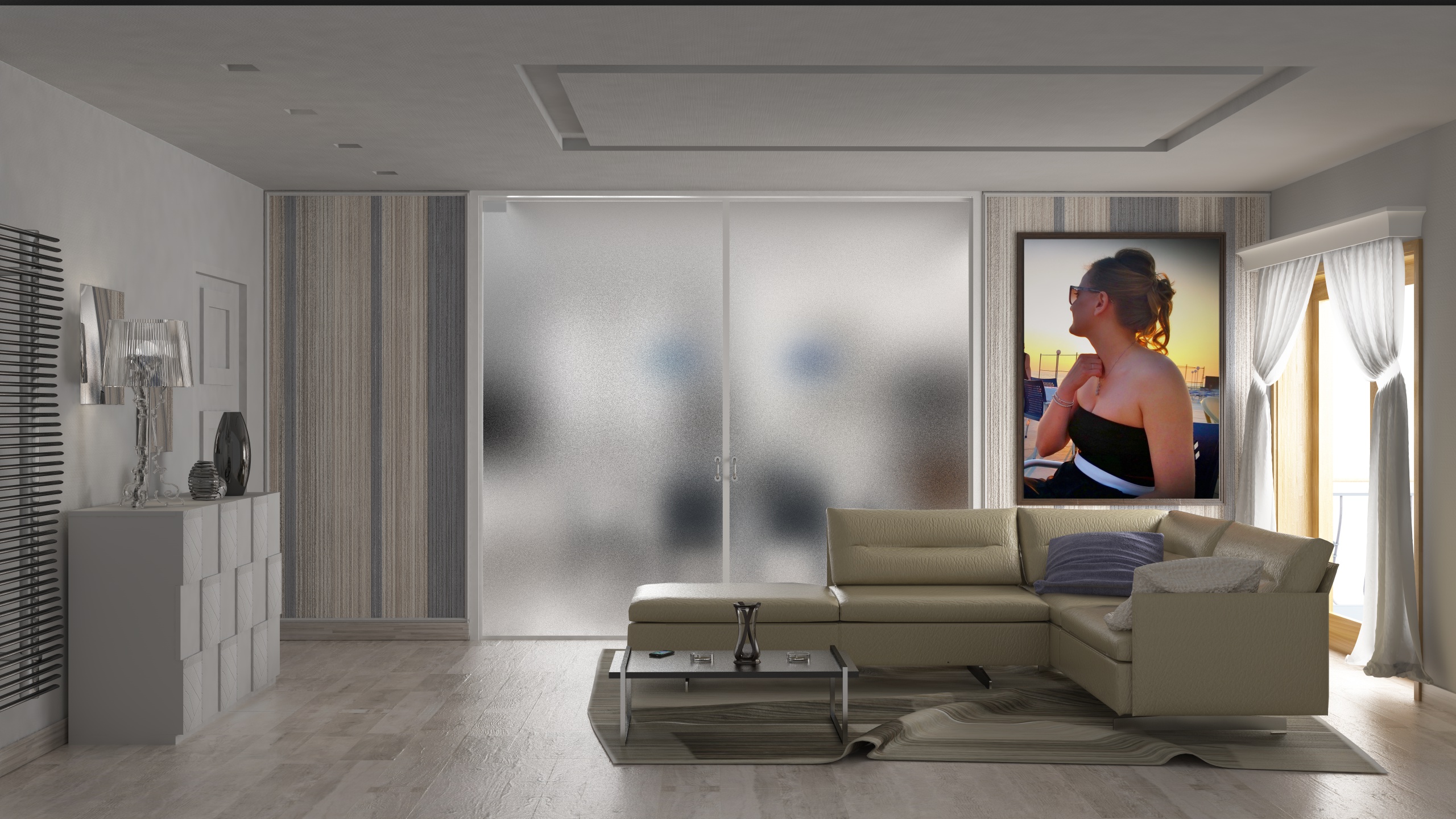 Il materiale del divano... o le tende, stranissime tende e il quadro è retroilluminato come un tv.