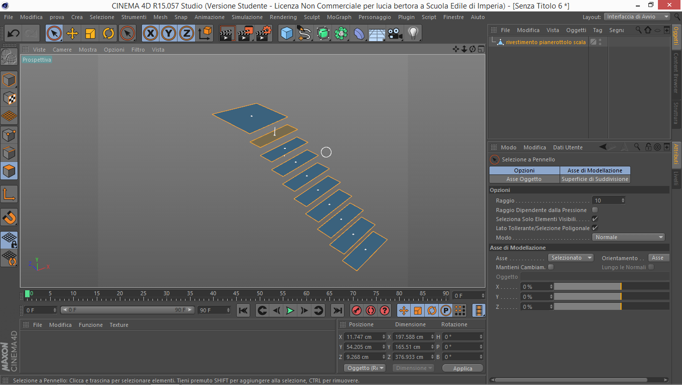 Ho creato dei poligoni mettendomi su una scala, per disegnare le piane sopra al volume degli scalini, con lo strumento crea poligono, vedi lo screenshot, ogni volta ho chiuso il poligono della singola piana e poi sono andata avanti con le successive senza uscire dallo strumento crea poligono. Alla fine è venuto un oggetto unico e copiandolo in un altro file per estruderlo mi trovo intanto che l'asse dell oggetto è lontanissimo e lo porto manualmente vicino all'oggetto e poi non riesco ad estruderlo ne a spostarne un punto. Tra latro se non sto con l'icona asse oggetto accesa non mi compaiono gli assi dell'oggetto anche quando è selezionato. Praticamente se faccio estrudi, sia punti che spigoli che facce e tiro le frecce non succede niente, si sposta l'asse e l'oggetto resta intatto. Grazie!!