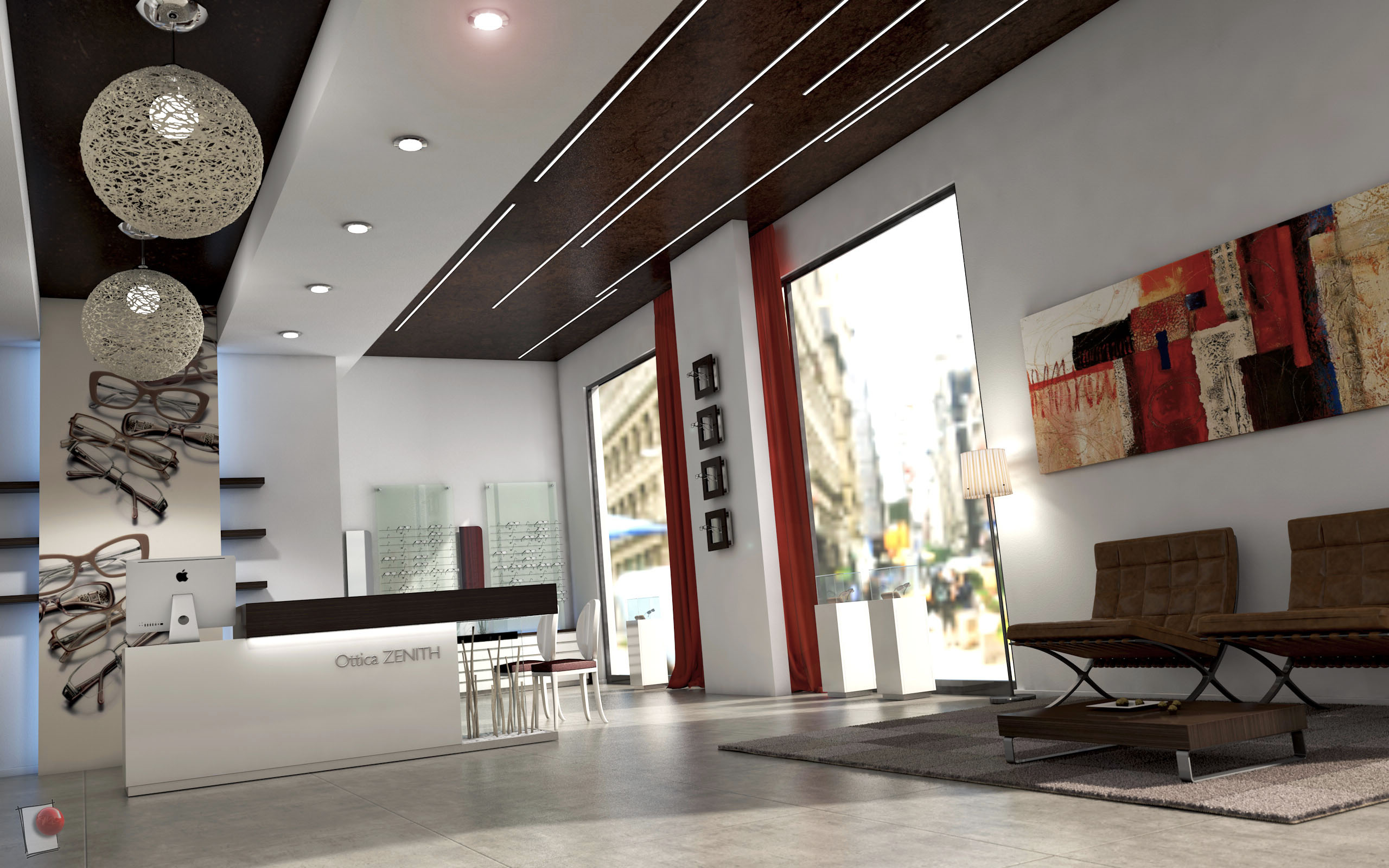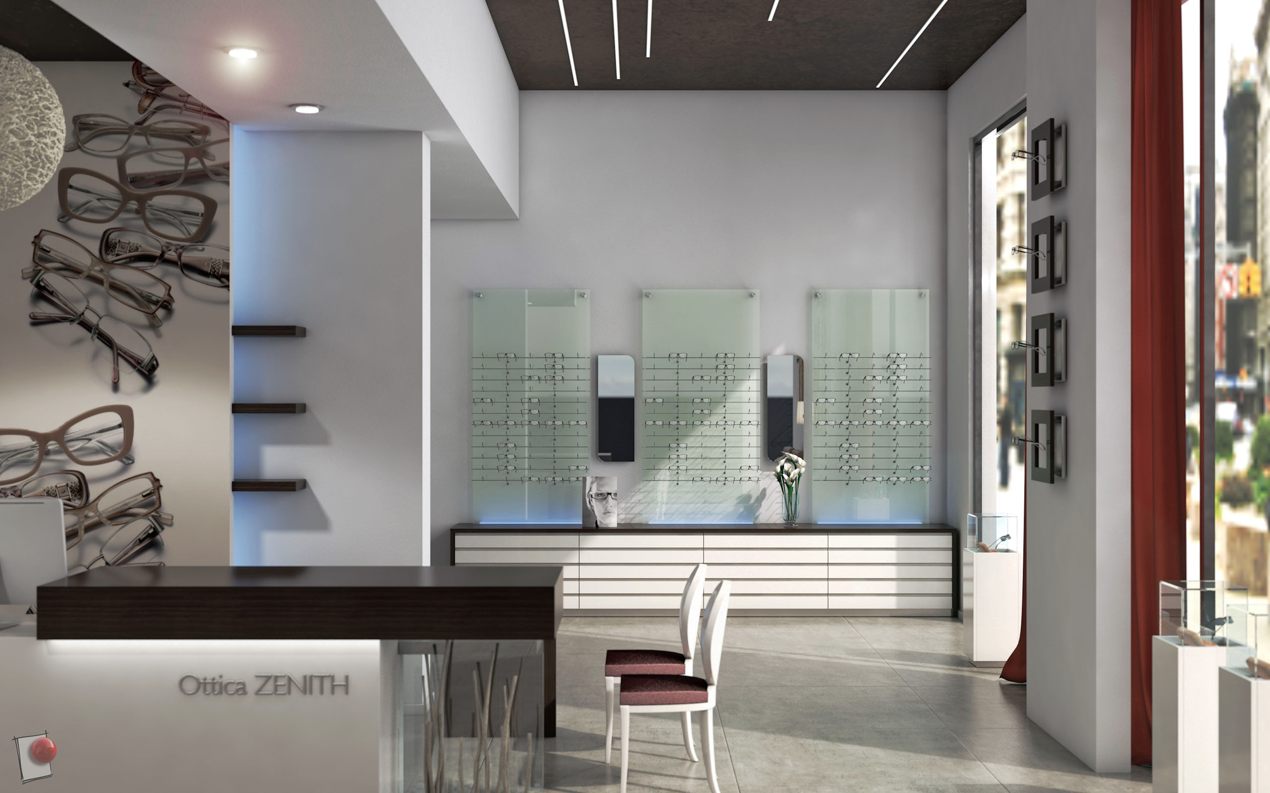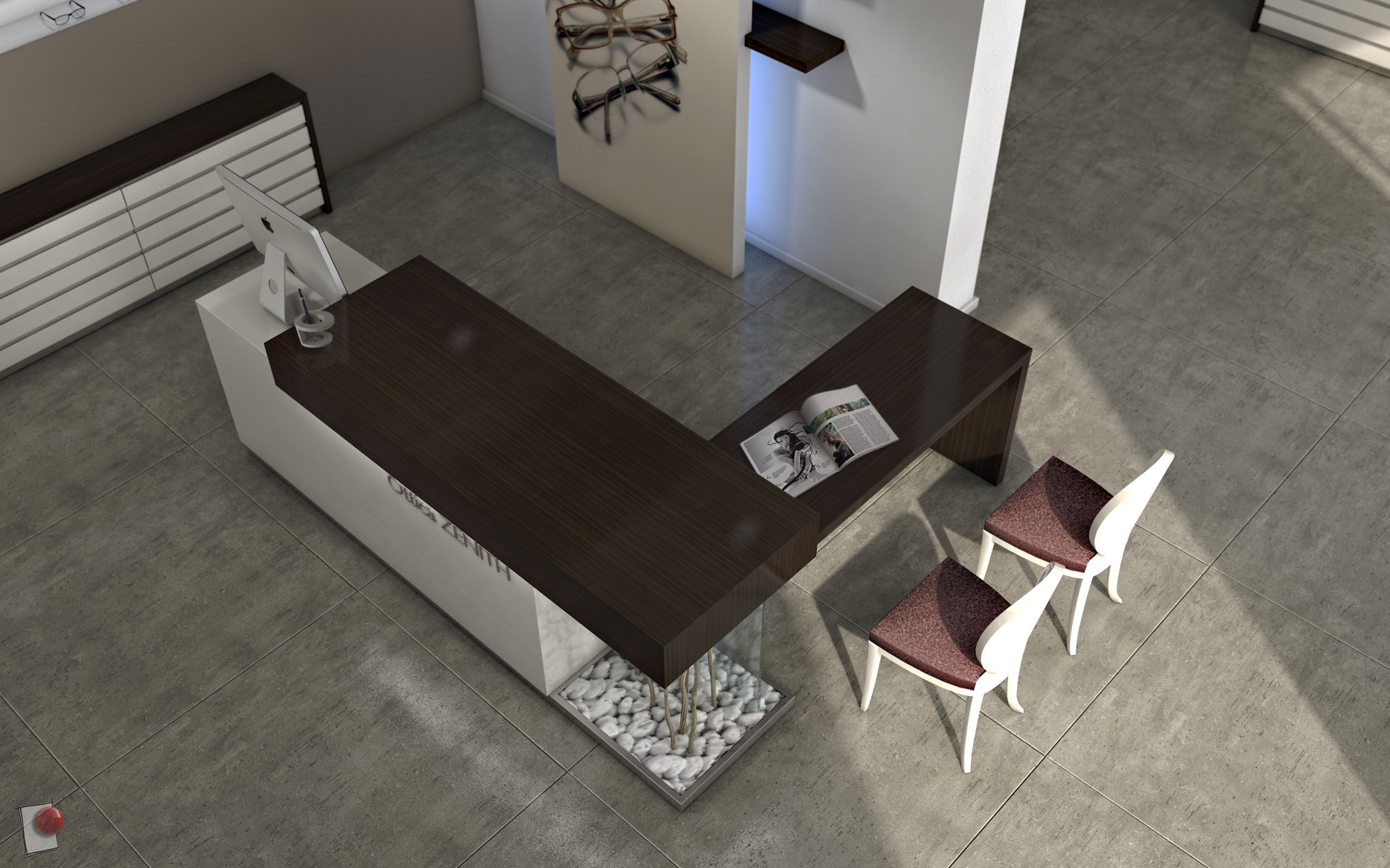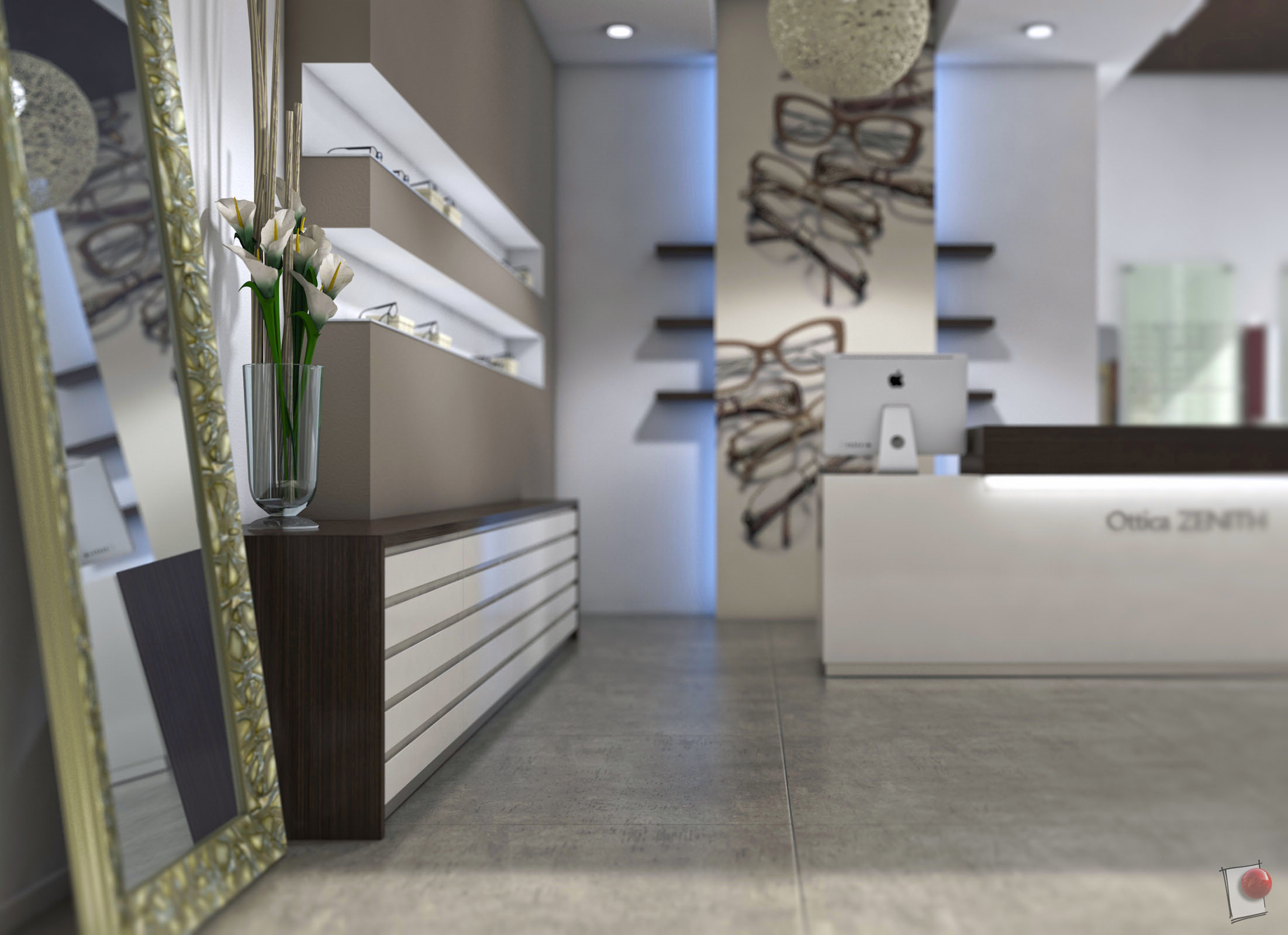 Per l'intro di un nuovo sito web di un'azienda che realizza arredamenti per negozi di ottica, ho creato questa ambientazione. Modello e rendering sono realizzati con la versione R15 Visualize (motore fisico).