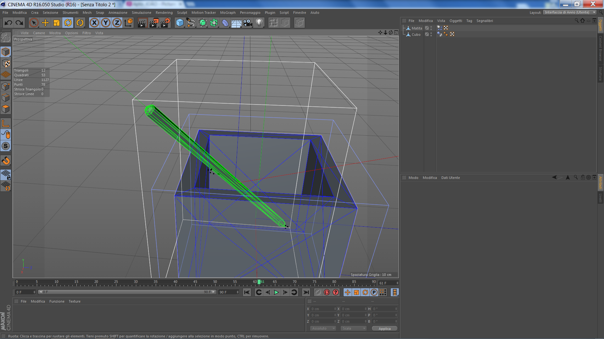 Modellati i vari oggetti riducendo al minimo i poligoni e la scatolina proprio base, sto provando ad usare le simulazioni di cinema per far cadere i vari oggetti dentro al contenitore, ma sorge un probblema: le matite non toccano il bordo della scatola ma restano a mezz'aria e non capisco il perchè.