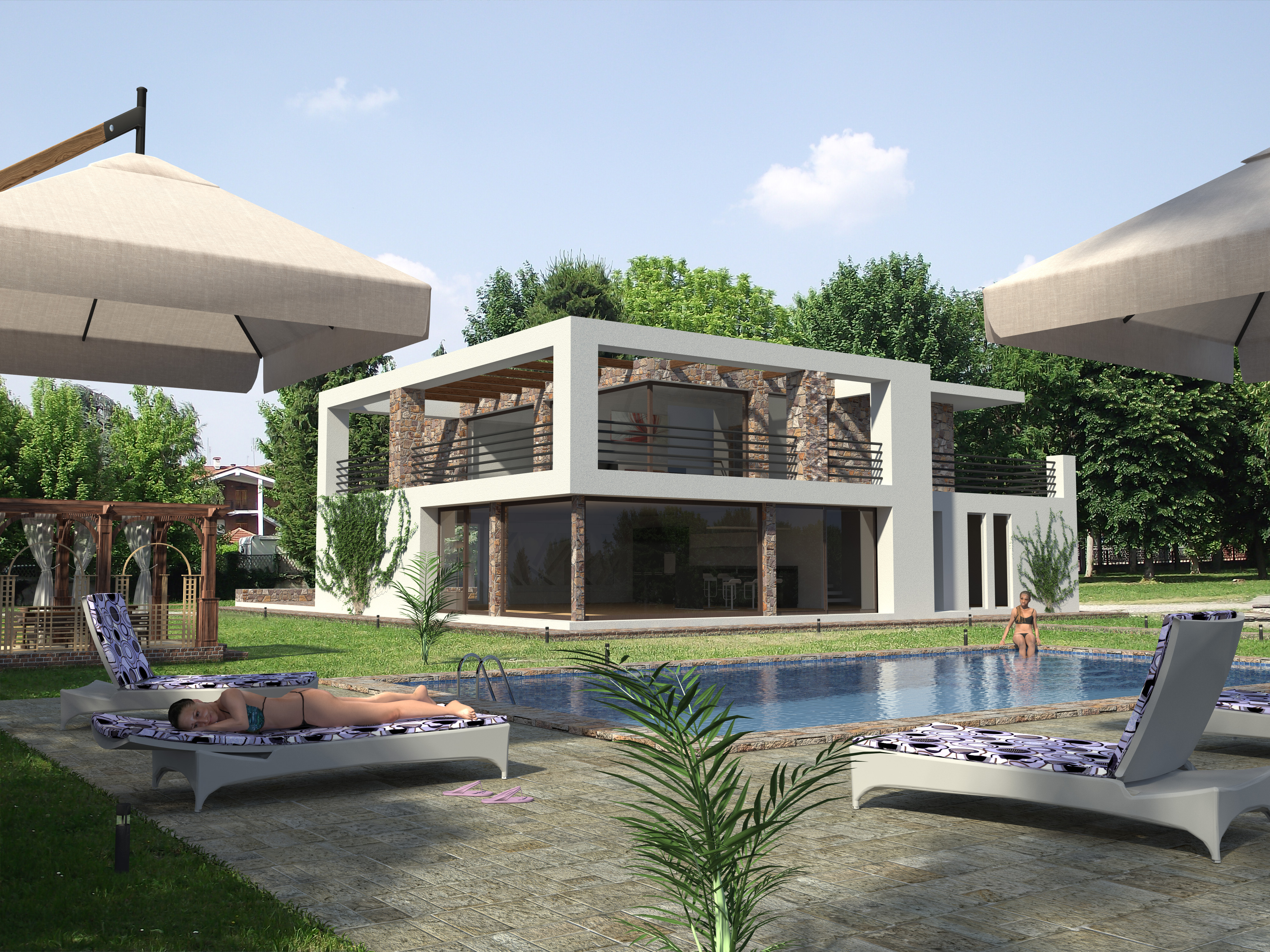 Innanzitutto non terrei uno scalino fra il piano terra ed il marciapiede esterno, cosa che oggi giorno si tende ad evitare per enfatizzare la continuità fra interno ed esterno, e ridurrei al minimo lo scalino fra marciapiede e giardino. I pilastrini rivestisti in pietra li eliminerei perché poco reali a causa della loro difficile se non impossibile realizzazione. Manca ogni forma di copertina o banchina. Per valorizzare i pilastri in pietra al piano primo li farei leggermente più stretti rispetto al muro in intonaco creando quindi un gioco di volumi. I semplici tubi usati come parapetto li arricchirei con il fissaggio a muro e aggiungerei un montante a quelli più lunghi che altrimenti fletterebbero. I travetti del pergolato non a filo muro superiore, impensabile. I serramenti, finti e per niente dettagliati cosa che per me in ogni progetto fa una grande differenza. Ipotizzerei un qualche sistema d'oscuramento, magari con frangibili scorrevoli così da avere anche dei giochi d'ombra nel render. Arrederei l'interno del piano terra piuttosto che il giardino. Ovviamente anche il bordo essendo in primo piano dovrebbe essere realizzato in modo veritiero, ma per questo ti invito a visionare un qualche progetto on line per farti un idea. ;)