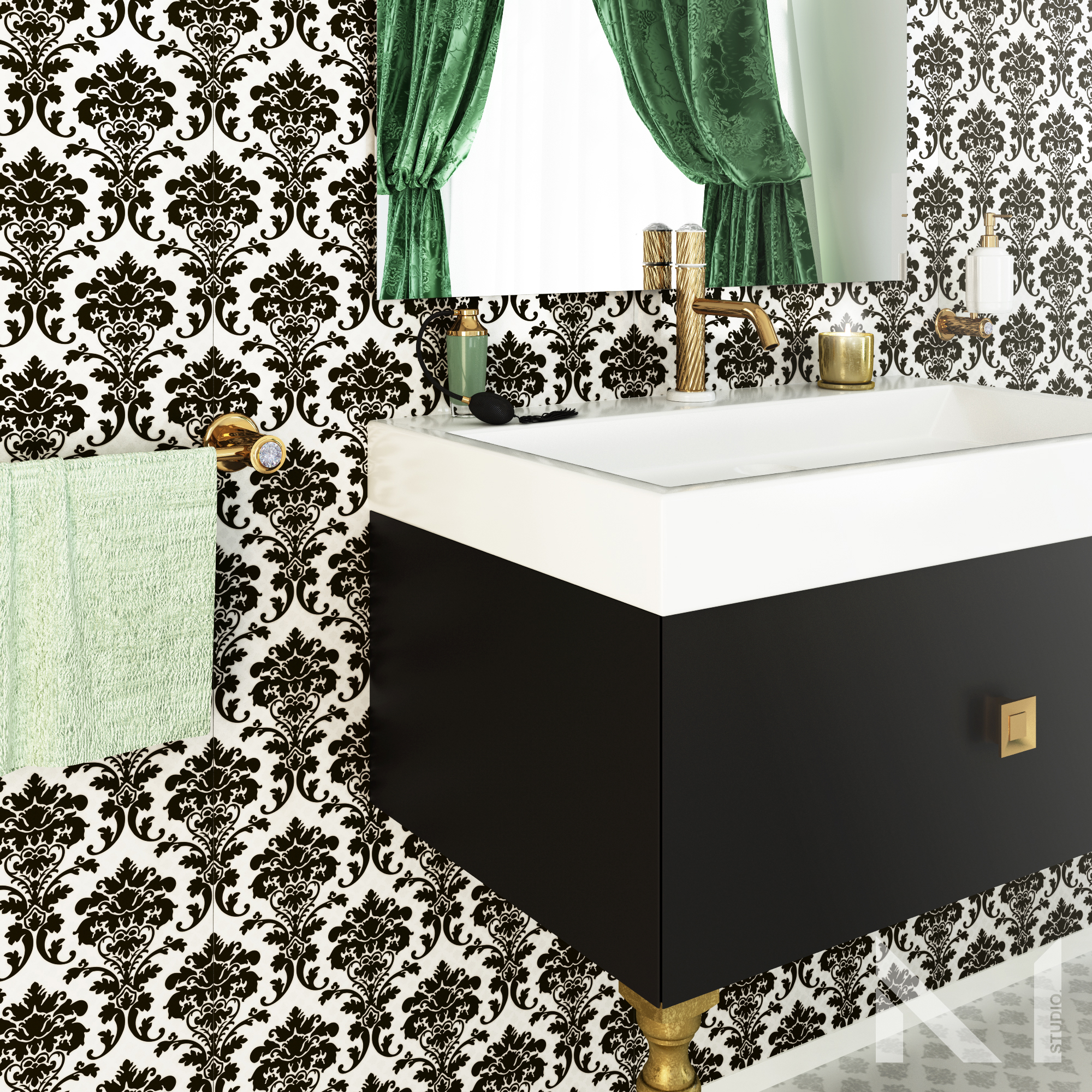 dietro le tende riflesse dallo specchio non c'e nulla, potrebbe esserci una finestra o altro ma cosi abbassa il realismo