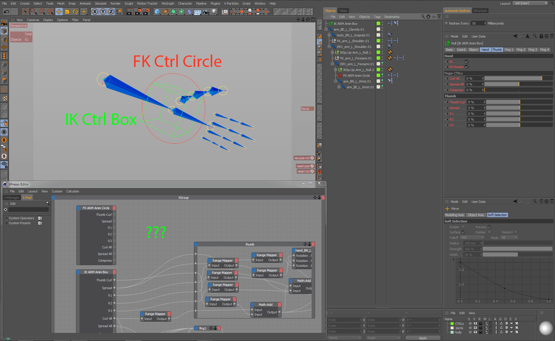 In my case for eg. a thumb & fingers controls of a hand needs to be drive and share its parameters parallelly from these two objects and control with them, not in same time but in turns. One for the IK state, another for the FK state. I have no idea what is the practice for this logical method and what nodes needs to be share to each other for a properly work.