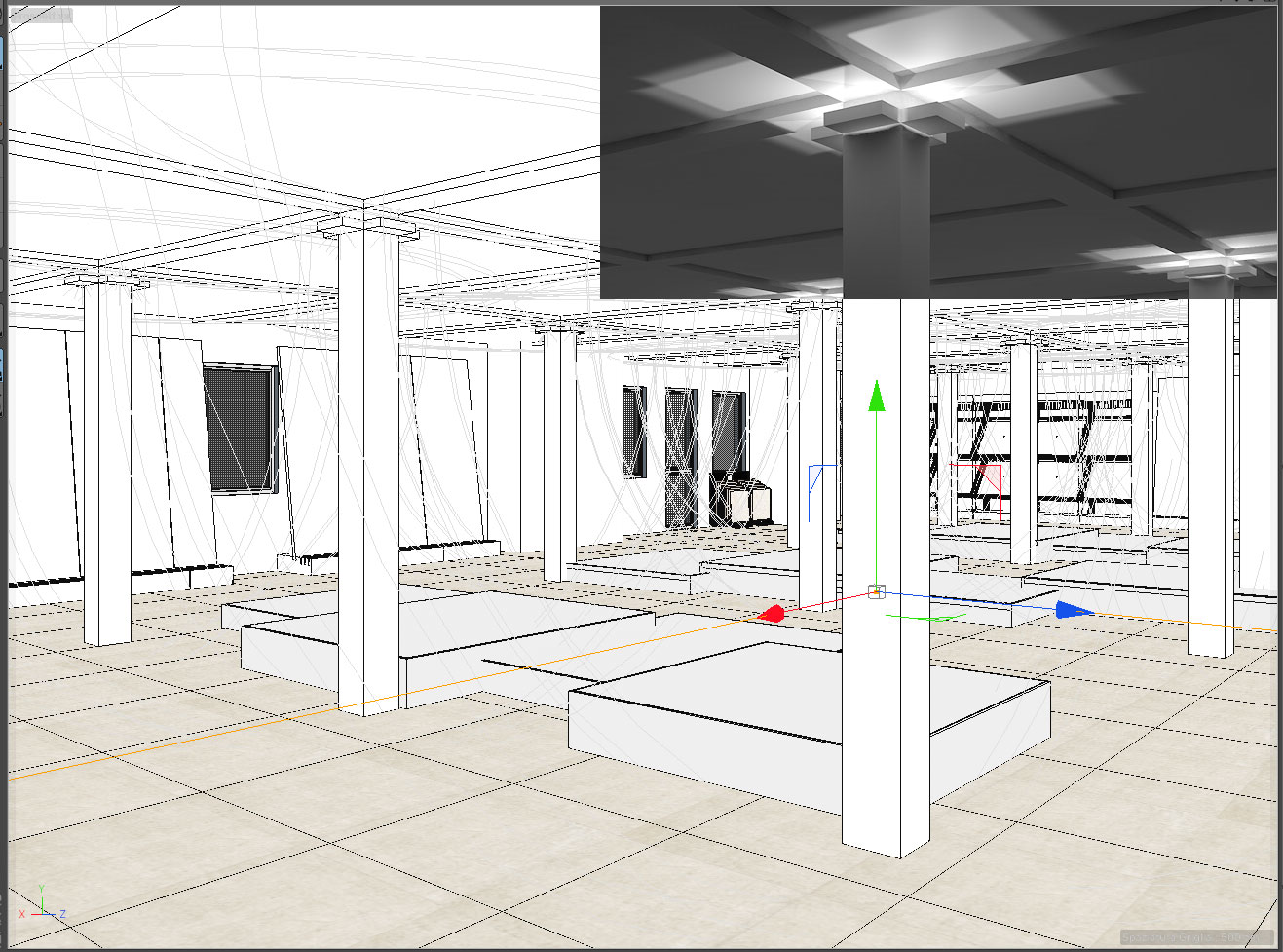 Questo è l'ambiente che sto facendo, ma mancano ancora moltissime cose: faretti al centro della sala, pannelli con grafiche, culle con piastrelle...