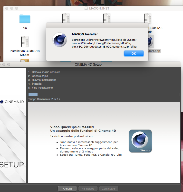 Ciao, proverei a buttare preferenze e installazione e rifare una roba pulita. Dagli screenshot però c'è una cosa che mi torna poco: il tentativo di estrazione da una cartella Preferenze di maxon che hai sul desktop... la cartella Library non dovrebbe essere sulla scrivania. Non è che per sbaglio hai spostato la cartella Library dell'utente?