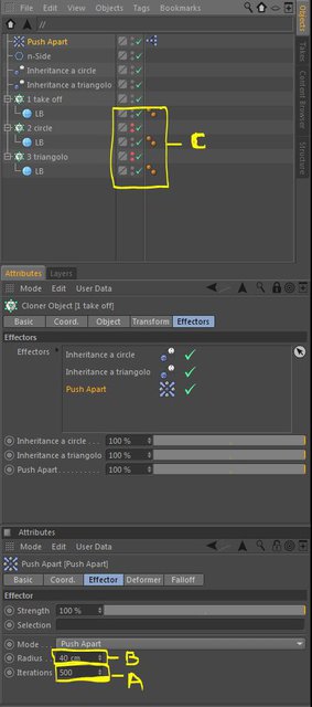 Ho però fatto una prova con il Push Apart e in effetti la reazione è troppo repentina, ma solo con i settaggi di base, cioè, mi è bastato aumentare a 500 [A] le iterazioni dell'effettuatore( ma puoi alzarlo ancora di più ) e anche se il radius viene aumentato del 25% rispetto alla dimensione delle sfere ( se le sfere sono 32cm, puoi portare il valore radius dell'effettuatore Push Apart anche a 40cm) l'interazione rimane fluida e abbastanza morbida, anche aumentando il numero dei cloni. Daltra parte, i Cloners che fanno da bersaglio, non devono essere disabilitati, ma nascosti [C], perchè, altrimenti, è come se non ce li avessi e mograph utilizza l' ultimo settaggio utile...