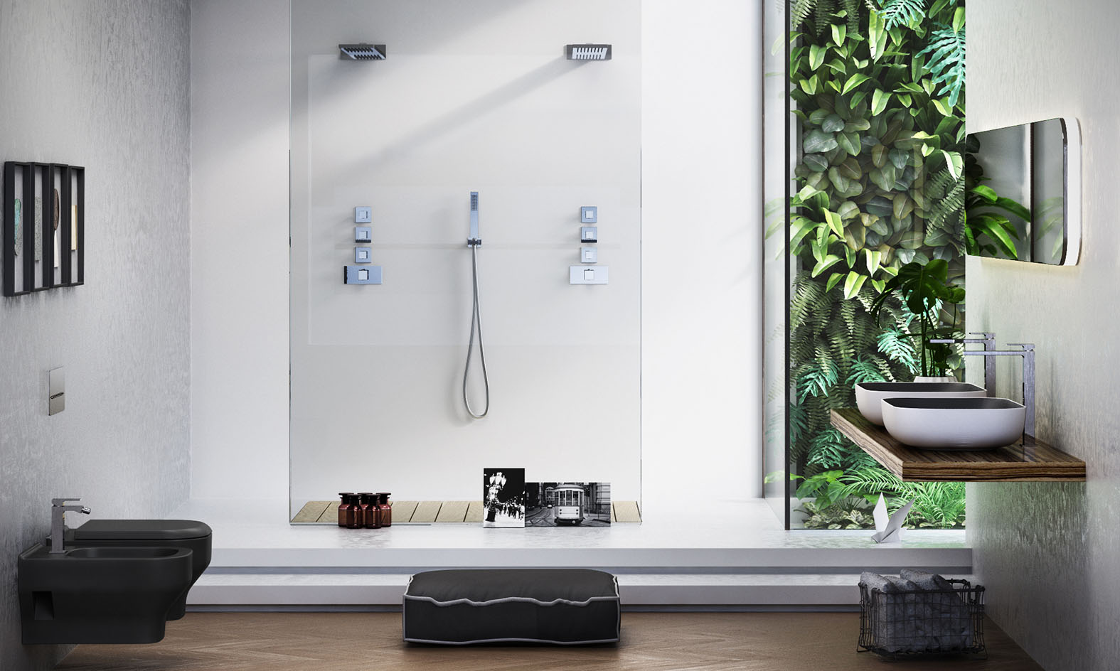 Riguardo al vetro doccia è normale che rifletta una luce area che illumina visto che succede anche in natura. L'illuminazione è una "brutta bestia" e solo provando e riprovando si ottengono buoni risultati. Considera sempre di ricreare un ambiente reale sia come potenza luminosa che come tipo di illuminazione.