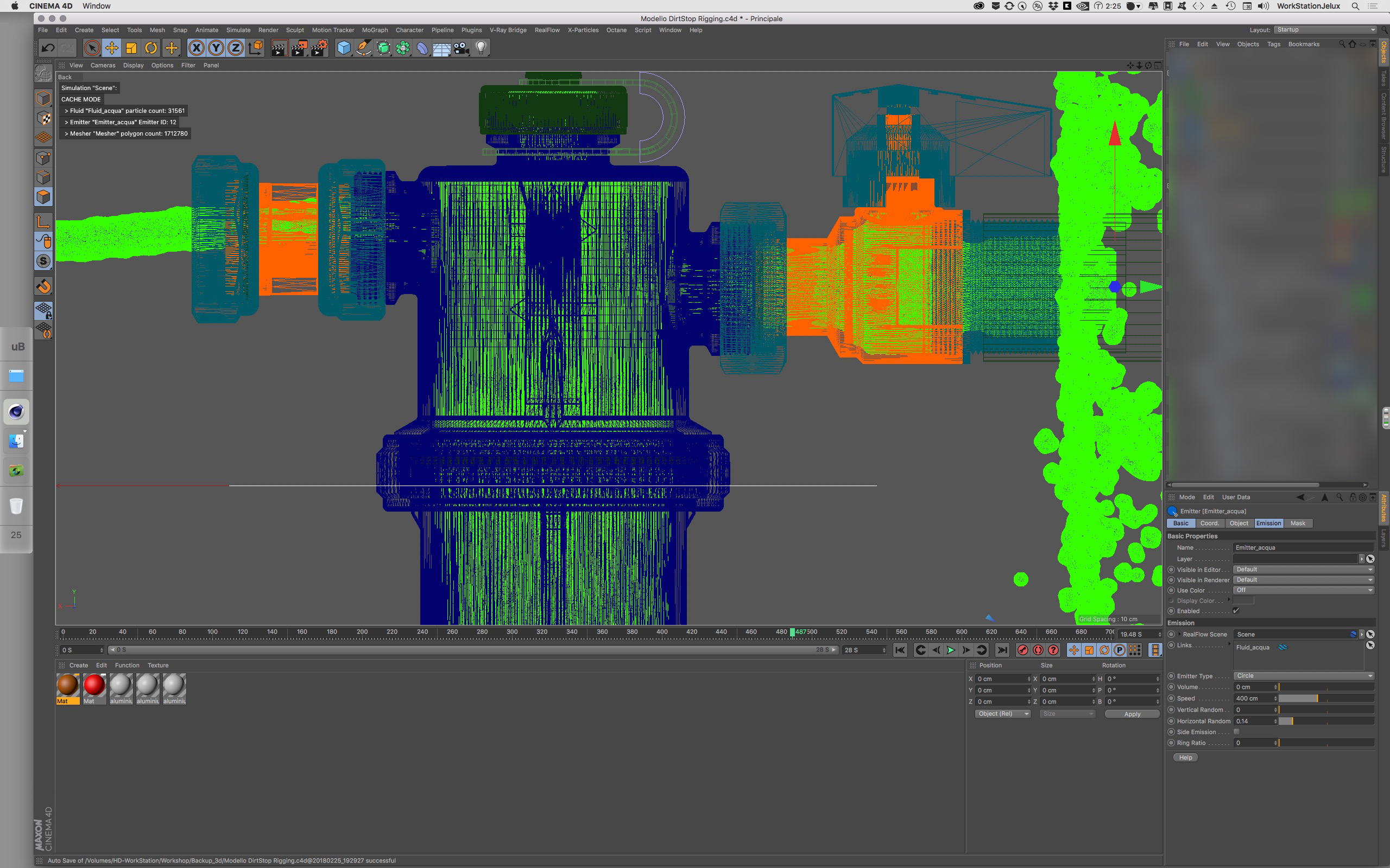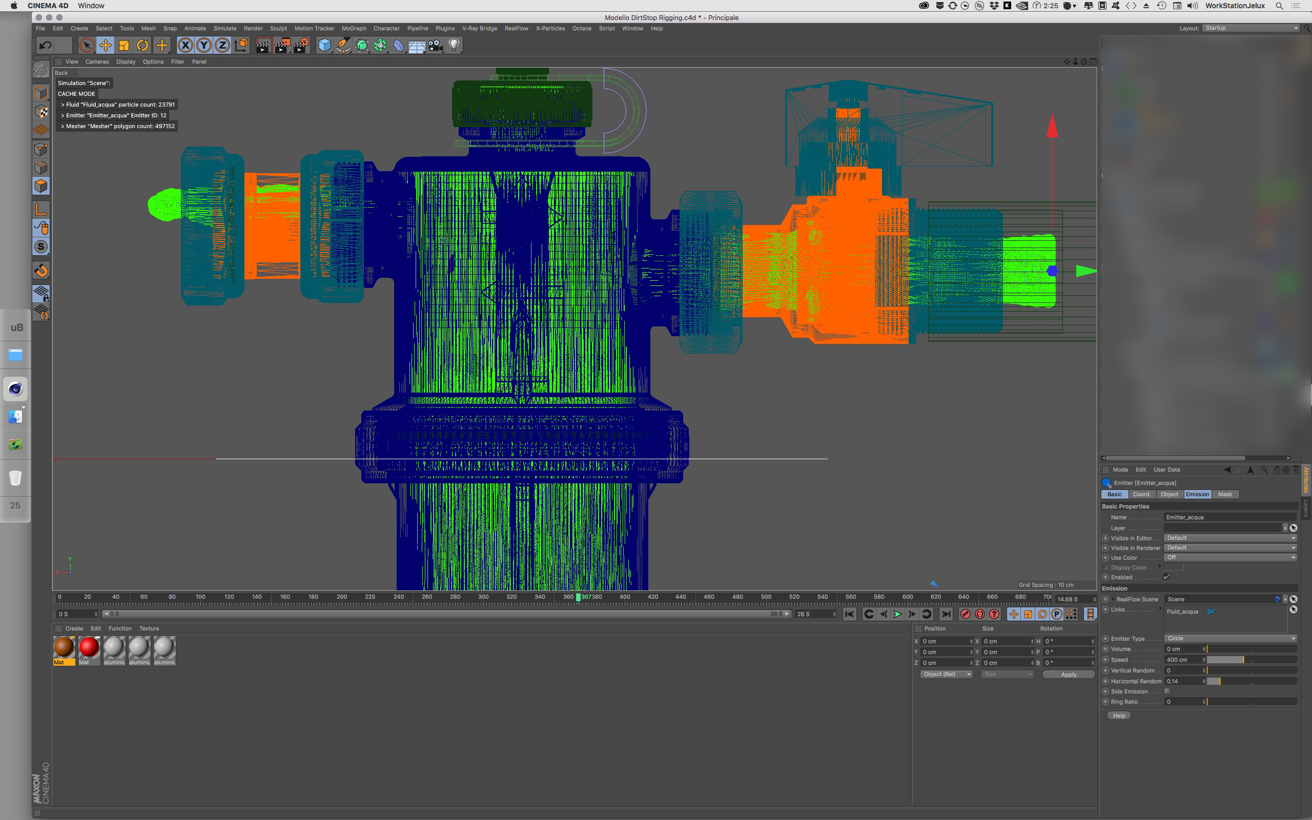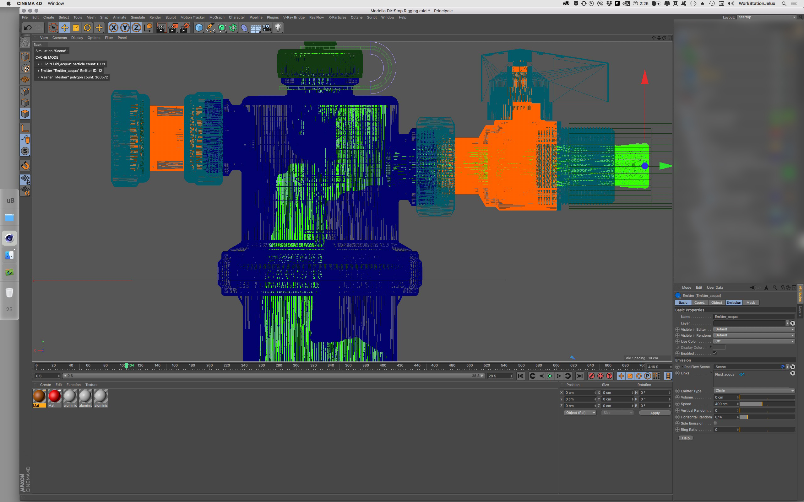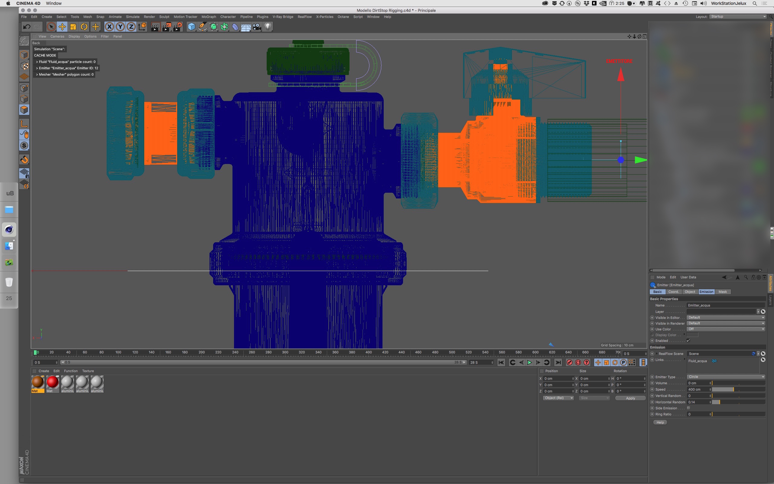 Per i più esperti è un gioco da ragazzi , me per me non direi. Primo problema il flusso d’acqua con lo sporco che fluttua, la mia prima idea è quella di user realflow unito a un emettitore e l’idea è di combinare le dinamiche con il fluido cosi che realflow trascini lo sporco. secondo problema il magnete, usando … riesco ad attrarre lo sporco ma non riesco a dividere il fango dal ferro e cosi tutto rimane incollato al magnete.