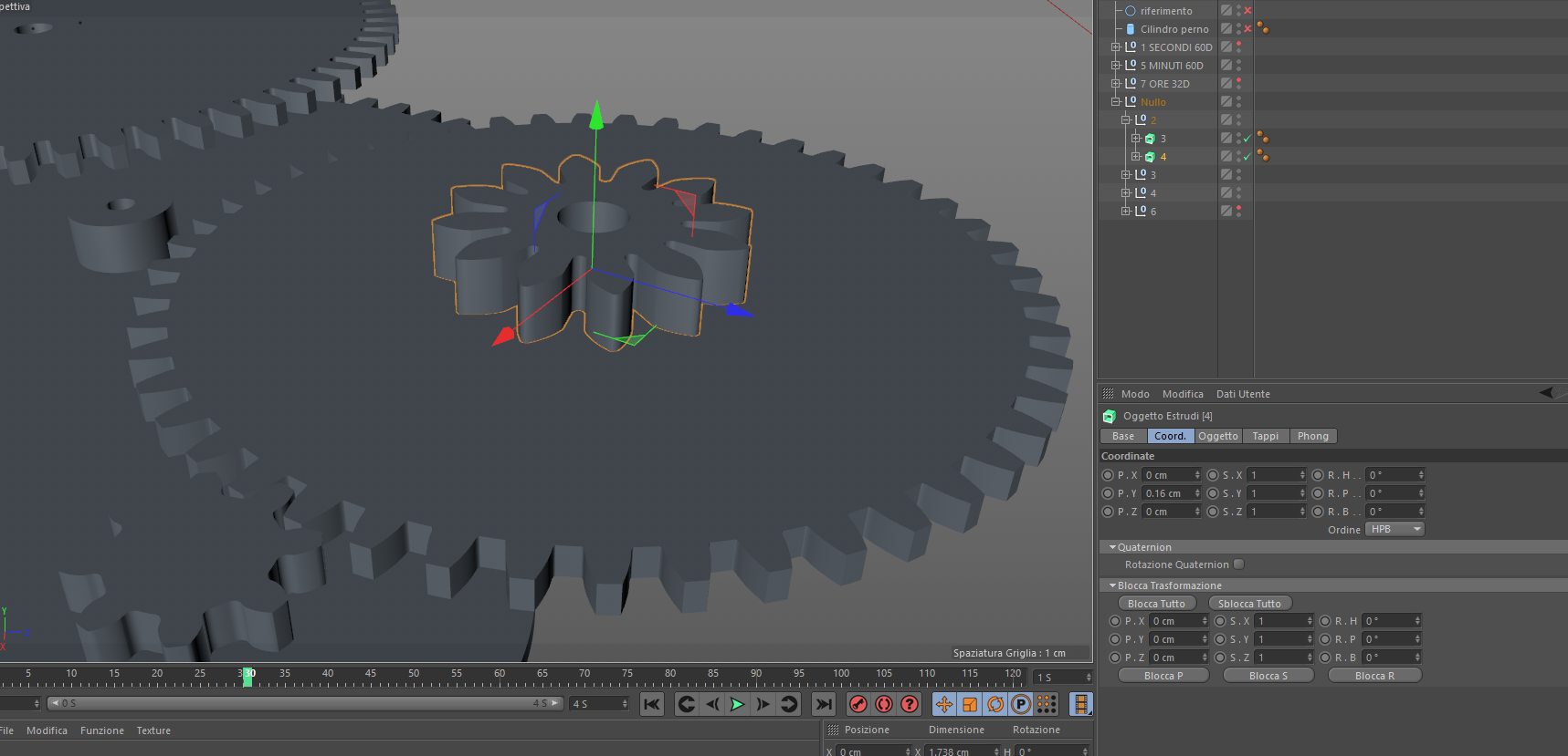 ho un oggetto nullo a cui applico una rotazione di x gradi ogni tot tempo, per intenderci l'oggetto nullo che nelle immagini si chiama 2, questo a sua volta ha due figli estrusi a cui non è stata applicata nessuna animazione nel tempo, il figlio(quello estruso) chiamato 3 segue correttamente la rotazione del genitore, mentre il 4 no, ho provato a cambiare l'ordine ma non cambia nulla, gli assi sono allineati, non so quale sia il problema.