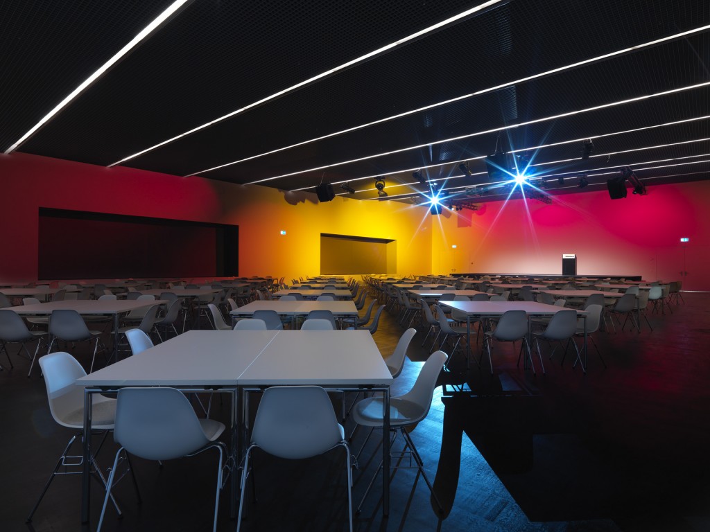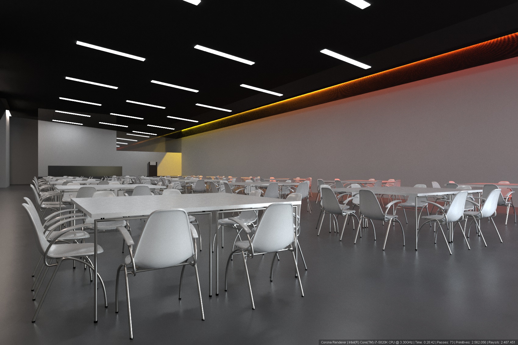 Allora nella realtà sono diversi elementi cha variano da una lunghezza di 2.1m ad una lunghezza di 2.8m. l’idea del mio cliente è: fare vedere questa sala con funzioni diversi, come per esempio utilizzarla per le conferenze (usando solo luce bianco) oppure per cene e varie con questa luce RGB. Quindi questa è ancora solo una prova per vedere l’effetto che fa, prima di definire i dettagli