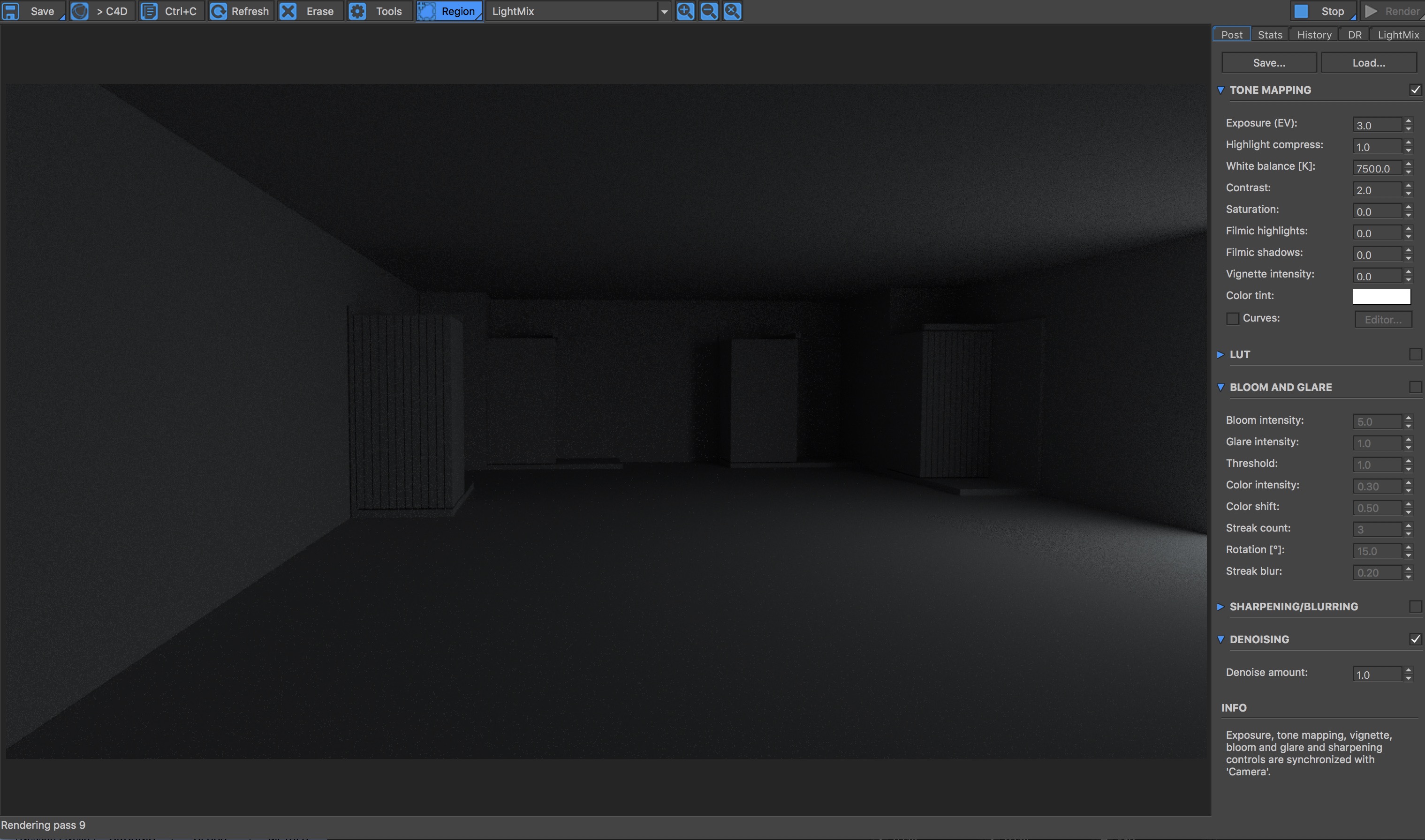 Poi ovviamente potresti aumentare l'esposizione usando l'esposition EV, che parte da "0" e metterlo un po piu alto, cosa succede? ti di brucia la scena, allora alzi un po sempre dentro la camera di corona il "Highlight compression" che comprime le alte luci fino a che non sparisce la bruciatura, puoi andare a livelli molto alti, dipende quanto se in overload con la luce. Diciamo che il gioco e' alzare l'esposizione della camera e alzare il compressore delle alte luci cosi' alzare solo i toni medi e medio bassi dell'immagine.