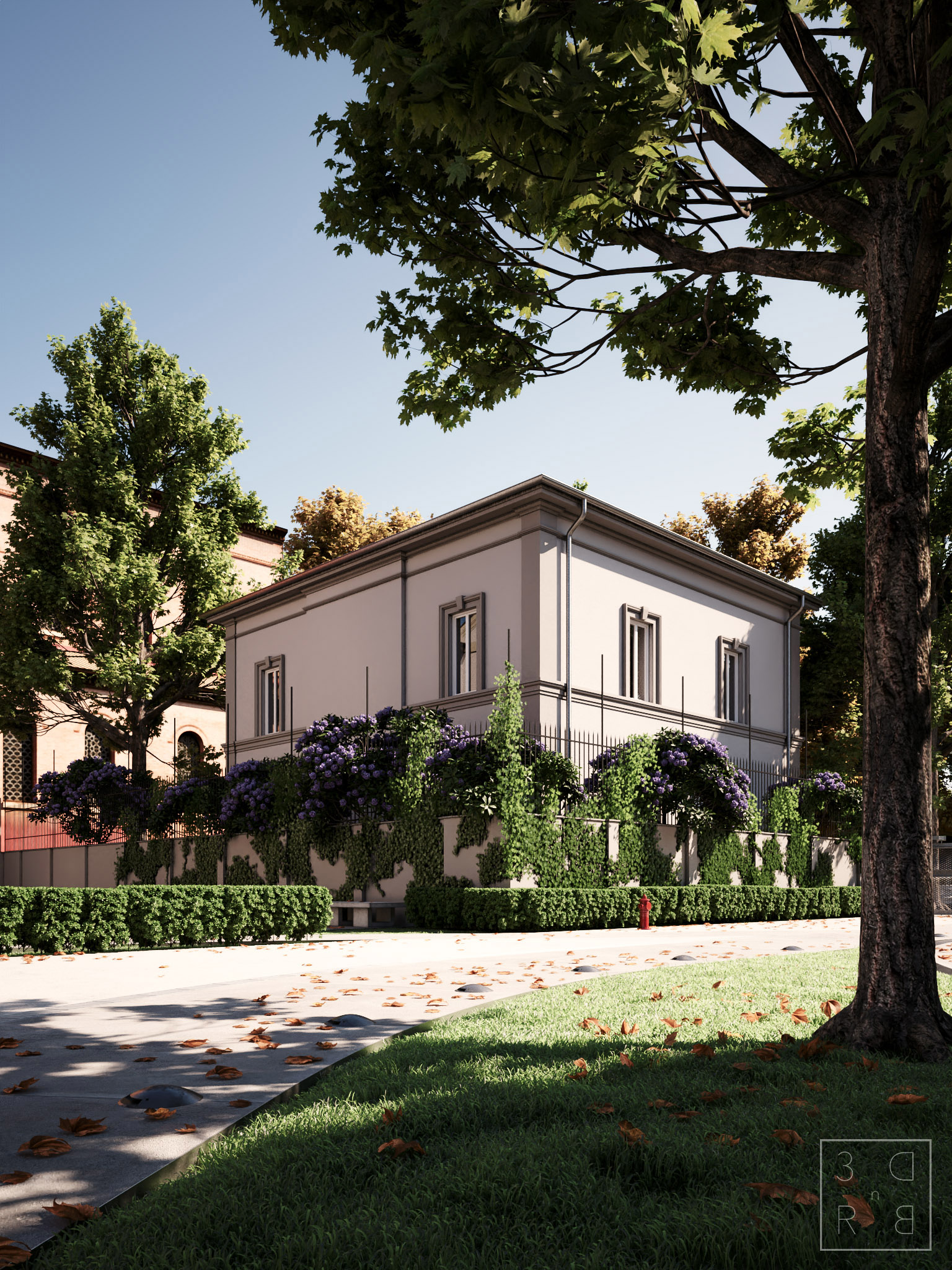 Tutti gli edifici dell'intorno sono modellati, il dettaglio non è il massimo ma come elementi di "contorno" vanno bene;) Gli alberi sono della libreria Cosmos mentre per l'edera ho usato il plugin di C4Dzone Easy Ivy. Per l'erba del prato invece del solito 2 sided material ho usato il nuovo SSS in modalità thin object, sembra funzionare molto bene. Le foglie a terra sono distribuite tramite il pen scatter tool della R25: