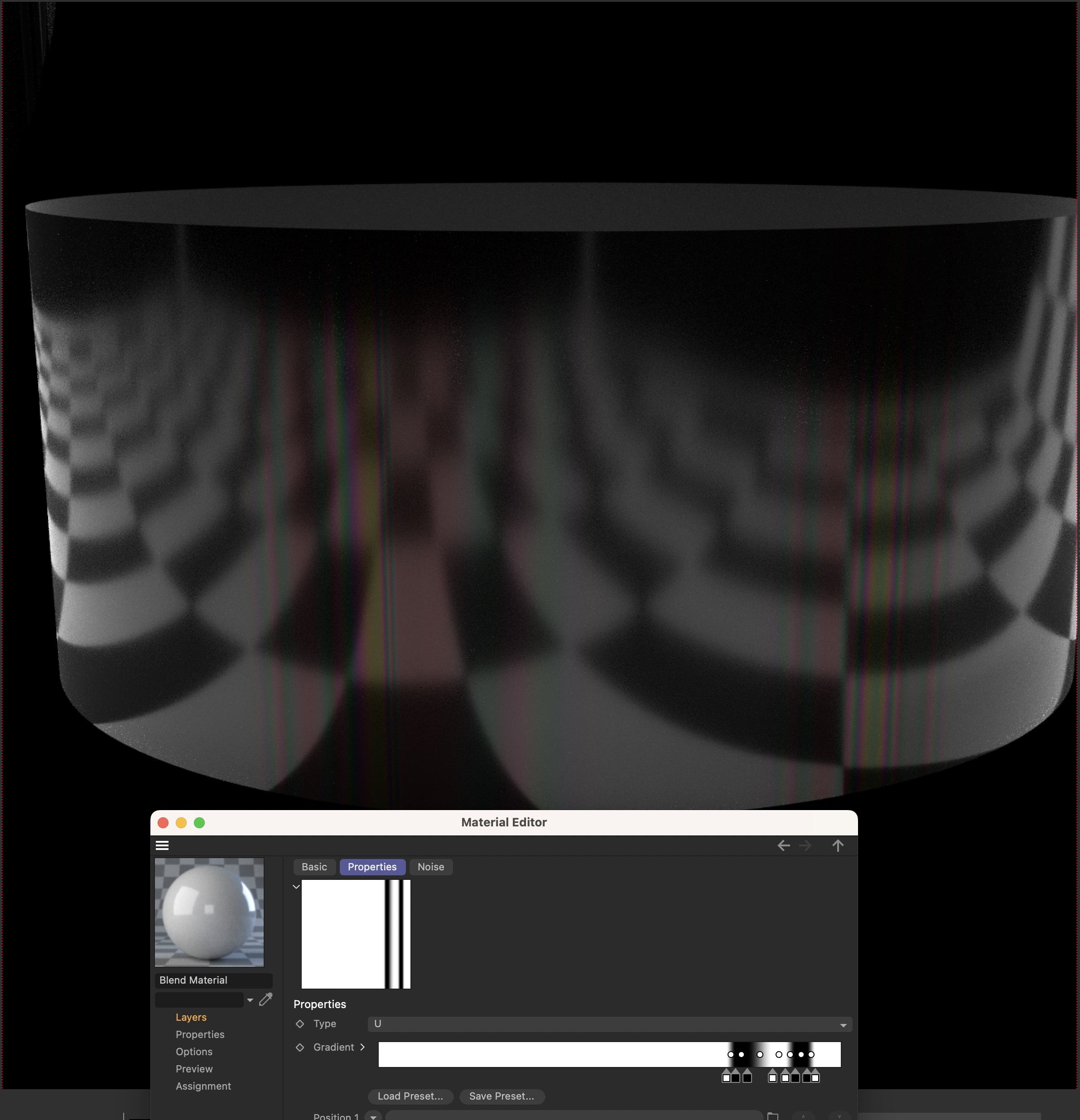 E' molto più immediato fingere l'effetto, e crearlo è banale. Quì nell'esempio ho due shader, uno basico (diffuse+reflection) e uno uguale con il thin film attivo dove ho usato un gradiente per stirare in verticale la componente iridescente. Fatto ciò ho mixato i due shader usando un gradiente per mostrare l'uno o l'altro nella posizione desiderata.