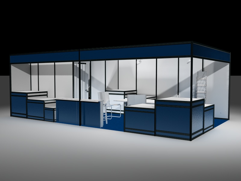 non è male il tuo preallestito. Mi trovo spesso nella situazione di disegnare stand fieristici e di solito non uso la GI...preferisco inseririre lo stand sotto una campana di luci distribuite con diversa intensità ed altezza. Questo rende, a mio modo di vedere, lo stand più verosimile. In seconda battuta attribusco le luci dei faretti con relative ombre applicati alla struttura vera e propria dello stand.