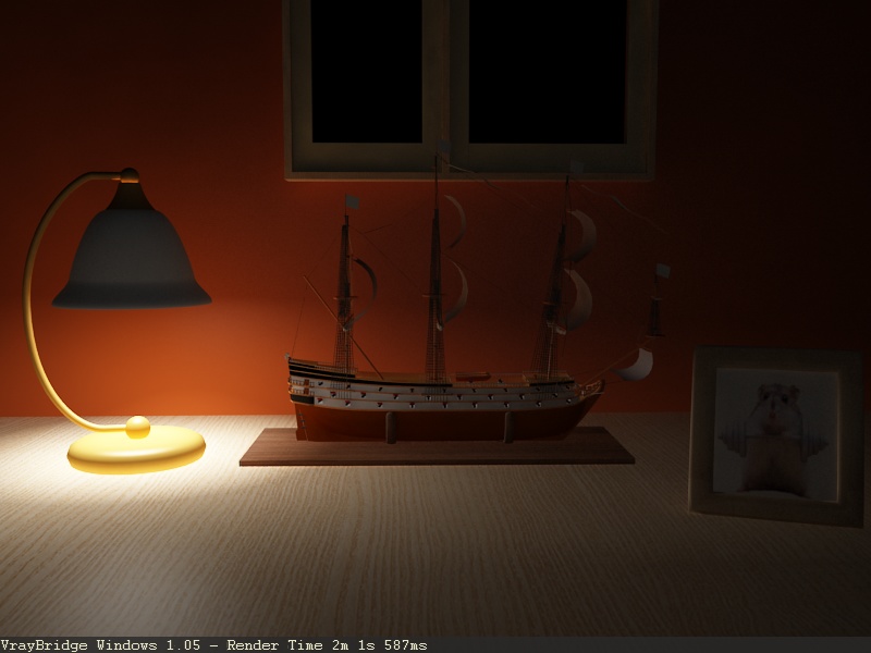 La prima cosa che ho notato è che hai usato una Light Area ed una Light Spot aumentandone l'Intensity...e perchè non hai usato, molto più semplicemente, una IES? A parte questo, perchè non hai spuntato "Enable Shadows"? Infatti il tuo render contiene un'errore madornale: non ci sono ombre. Come minimo il galeone dovrebbe proiettare un'ambra contro il muro di fondo..........