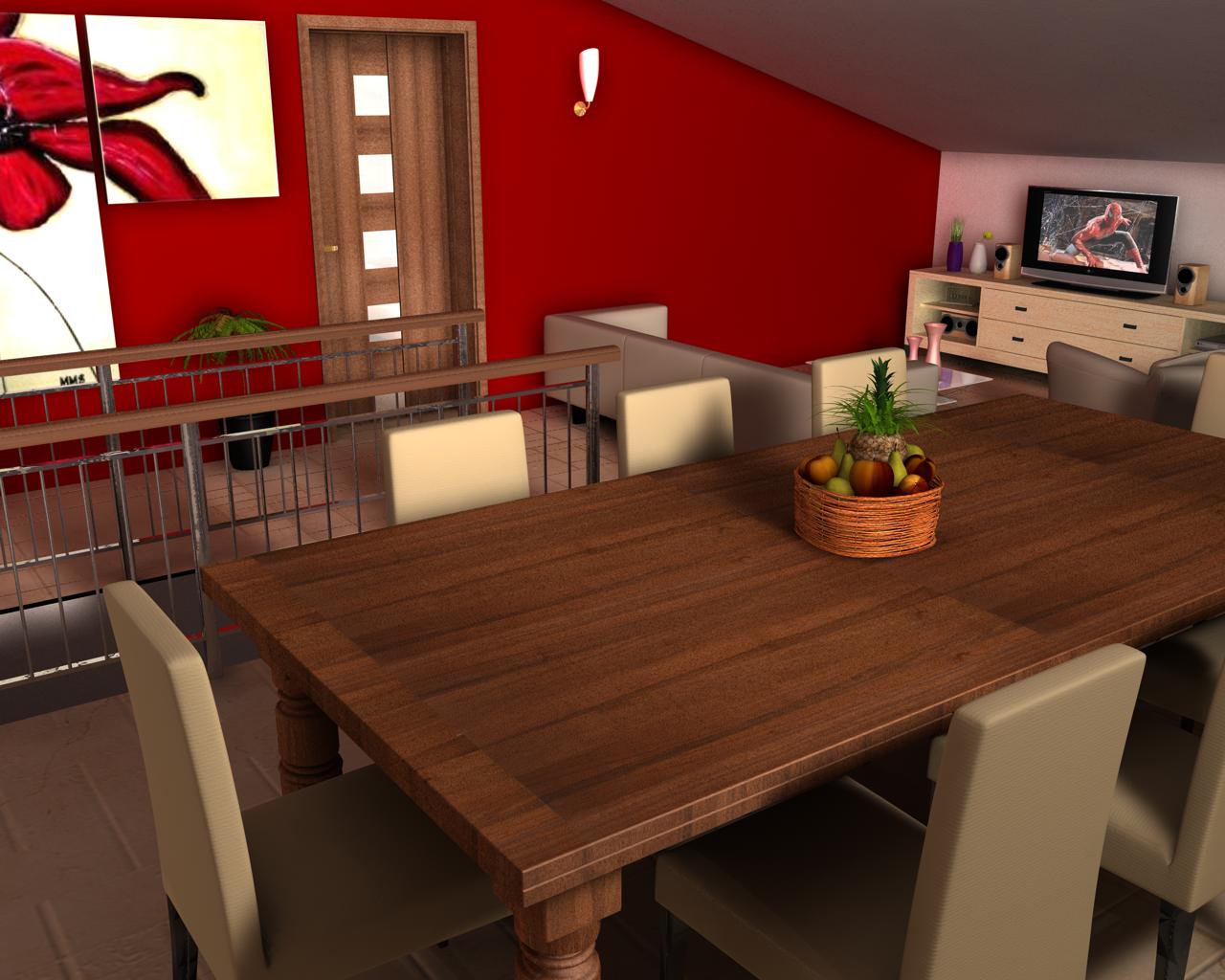 Non male per essere un secondo lavoro..complimenti!!. Io, oltre ai validi suggerimenti che ti hanno dato gli altri, se nn ci sono vincoli progettuali farei dei cambiamenti all'arredamento. Visto l'uso di oggetti moderni continuerei ad usare quelli...come ad esempio il tavolo ne metterei uno tipo di in vetro dal profilo sottile. Anche la ringhiera troppo classica..ci vorrebbe una geometria più slanciata. A terra userei del parquet ed eliminerei quel mobile di legno col portafrutta. Migliorerei anche la texture del soffito a grana un pò troppo grossa. Gli oggetti sul tavolo davanti alla tele li farei un poco più grossi e terrei dei colori che si amalgano meglio con il rosso della stanza.....ed infine modificherei l'obbiettivo della camera dando una prospettiva più ariosa all'immagine.