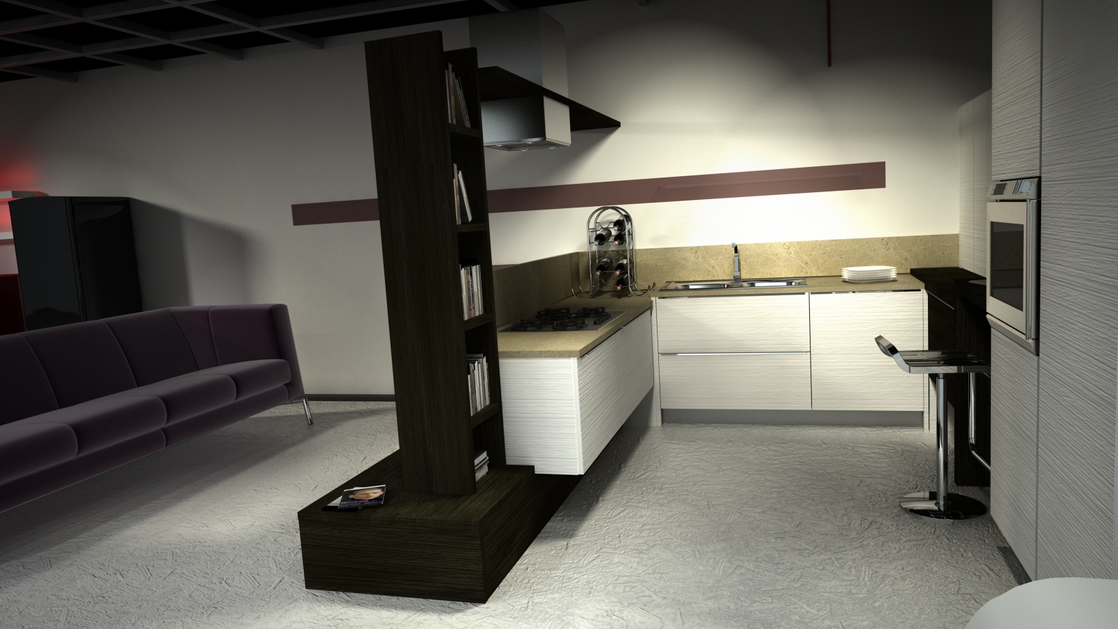 sul pavimento si vede come una circonferenza/cerchio di luce....e i faretti nella cucina non sono molto realistici...dovrebbero avere il "cono di luce" più stretto...