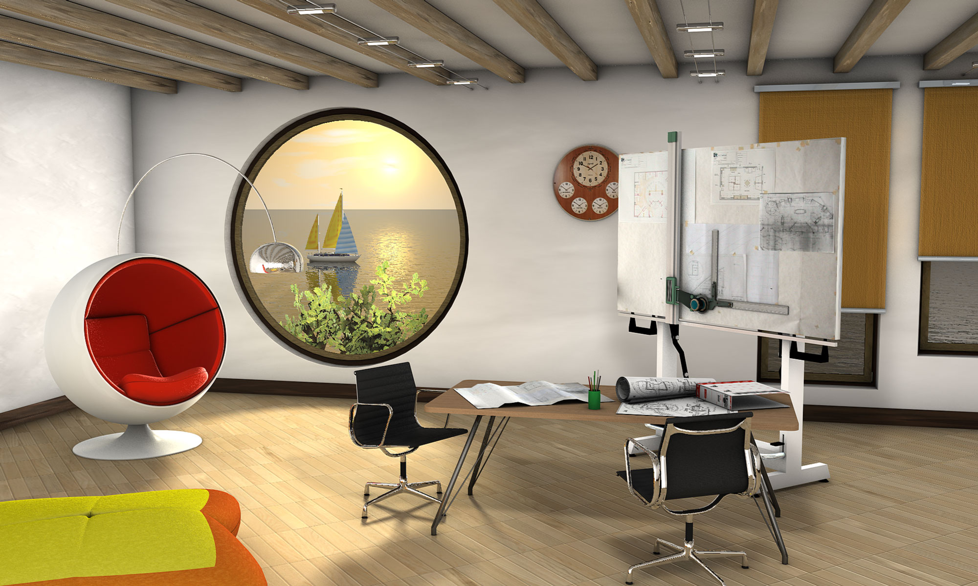 il buco tondo secondo me si sposa bene stilisticamente con la poltroncina e la lampada arco, quoto per ingrandire la lampada e rimpicciolire il cuscino,(anche se lo toglierei proprio.... per la texture del cuscino dovresti avere degli oggetti nel browser tra cui dei divani, prendi la texture da quelli e poi ci metti il colore che ti pare o comunque il colore è troppo vispo per lo sfondo secondo me dovresti abbassare un po' l'orizzonte che così ruba un po' l'occhio, ma c'è il vetro? se non c'è mettilo la riflessione della poltroncina aiuta secondo me , quoto la diffusione di luce che manca dalle due finestre di lato,