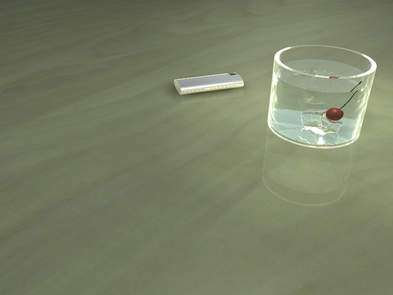 ....perchè non provi ad aggiungere un pò di smussature alla forma del bicchiere...anche se microscopiche il vetro le deve avere....ti da una sensazione di plastica perchè effettivamente la plastica, anzi la resina acrilica può essere così tagliata senza smussi....prova a colorare i cubetti come se fossero stati fatti con dello sciroppo, potresti creare riflessi interessanti, oppure la bevanda...credo che faresti vibrare di più il tutto..... :)