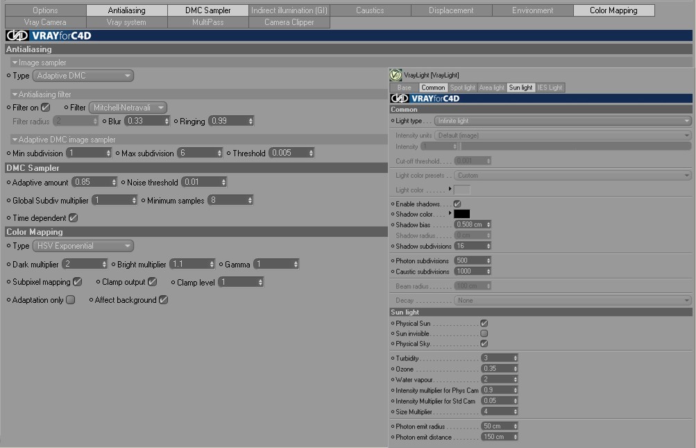 infinite light, physical sun, physical sky, skm 60%, per il resto parametri standard.