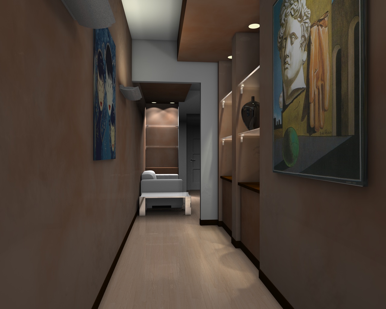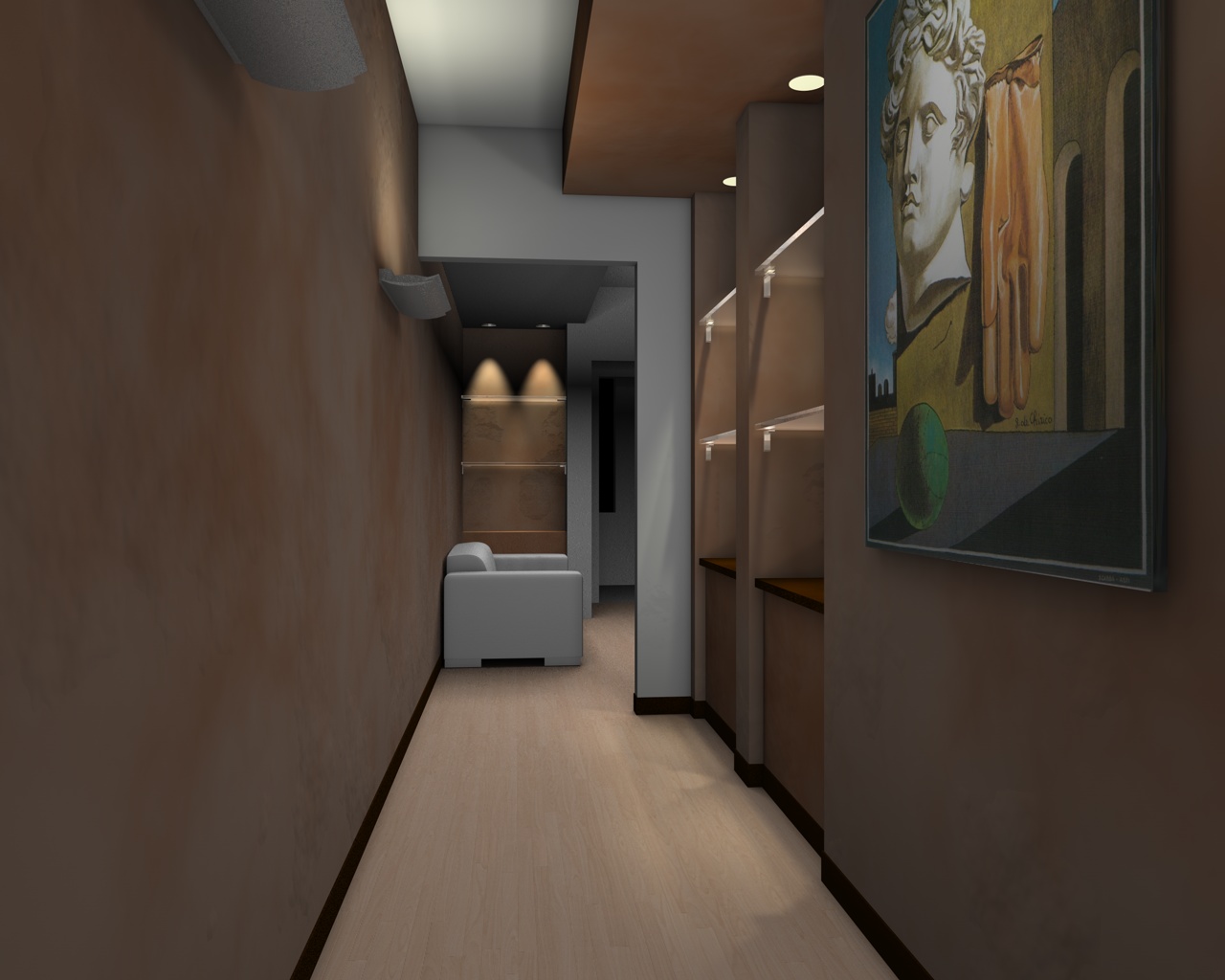 utilizzando sempre il metodo dei globi (master con ombre morbide - intensità 3% - decadenza lineare 500mt - densità ombre 90%), luci spot nelle vetrine con ombre morbide - luci area rettangolare sulle applique con decadenza lineare 500 mt intensità 180%