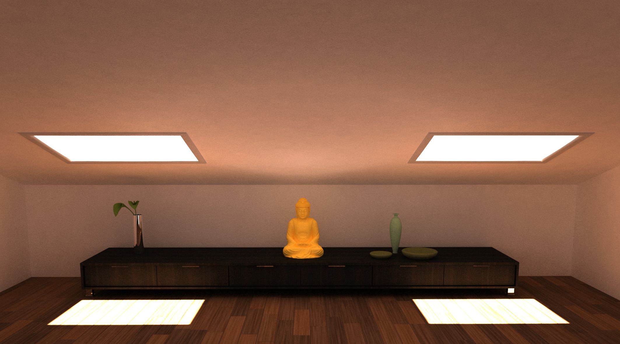 ciao, posta i parametri così possiamo capiire meglio come "ritoccare" il render, io cmq,nella mia ignoranza, prenderei un paio di accorgimenti: riguarderei un attimo il color mapping (le aree chiare sn bruciate, quelle scure, sn tr scure), e forse giocherei un pò anche col white balance per togliere quell'effetto "rosè", in fine, riguarderei anche gli speculari dei materiali (la statuetta dovrebbe essere d'oro?), un'ultima cosa, ma questa è puro gusto personale...io mi sposterei da una prospettiva centtrale, mi metterei un pò di "sgaido" e ruoterei la camera di qualche grado sull'asse Z...(inquadratura figosa)