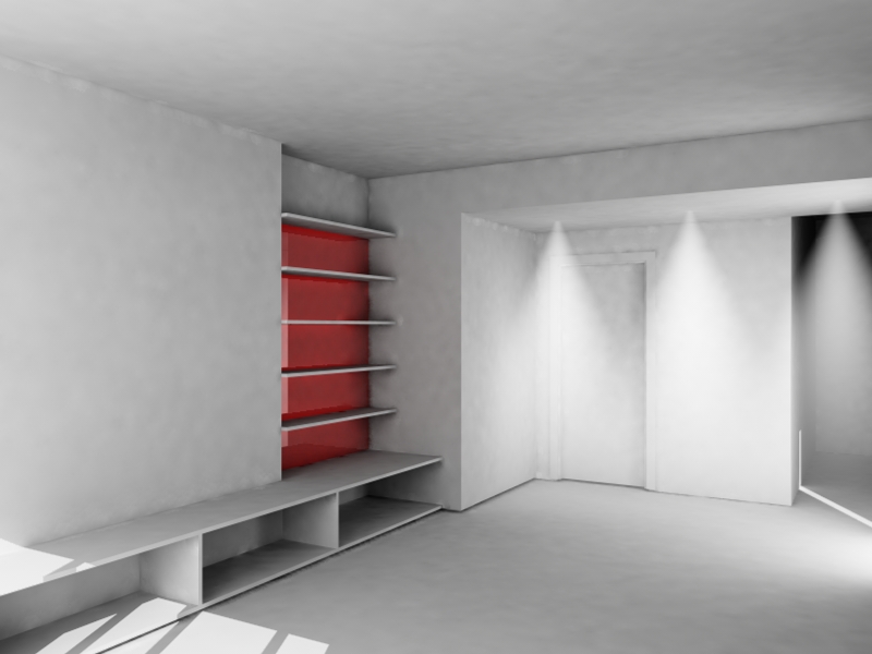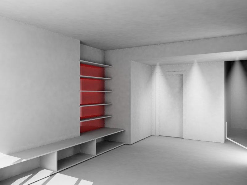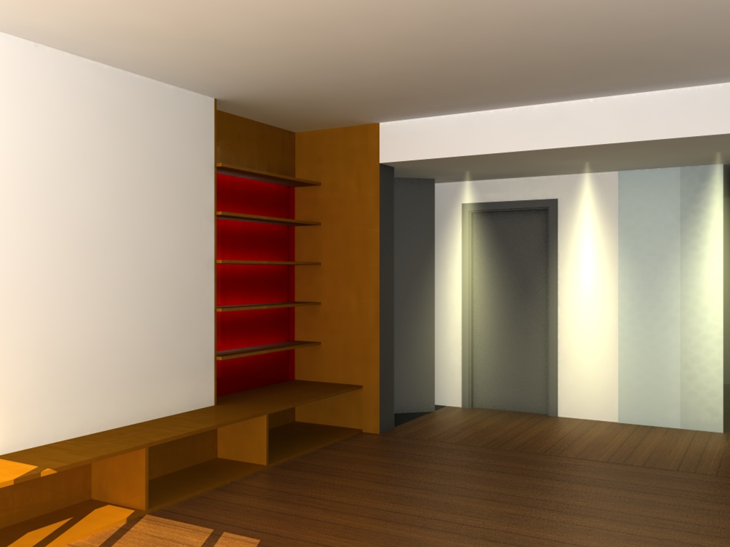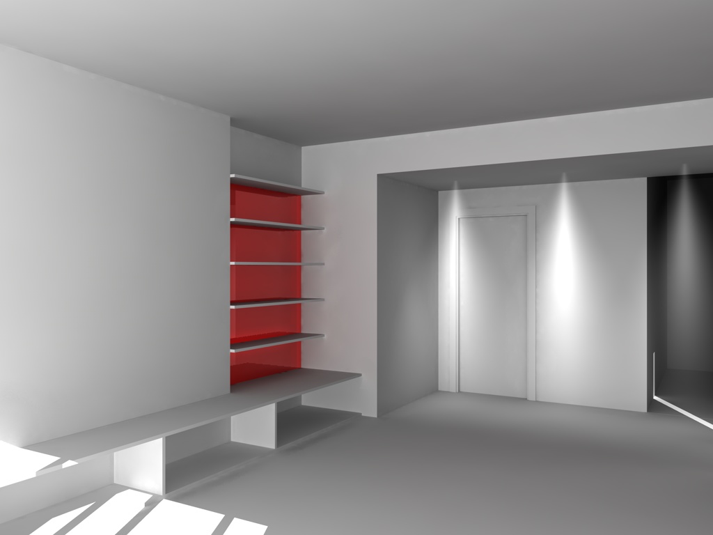 luci:un sole, un pannello con materiale dotato di sola luminanza e visibile solo da GI alla finestra dietro la camera, gli spot che si vedono e dei neon dietro le mensole sul vetro rosso...