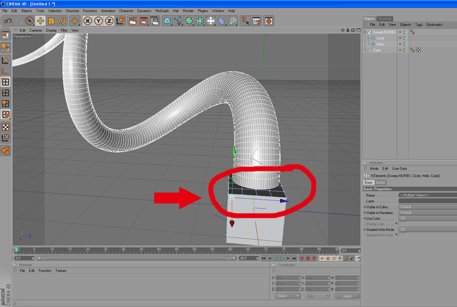 Salve a tutti, ho un problema con la "connessione" fra 2 oggetti (vedi immagine). Uno è circolare e l'altro è quadrato. In realtà stò creando una piovra e volevo creare i tentacoli con una SWEEP NURBS + un Helix con cerchio (come da immagine). Il corpo lo modello con cubi messi in una HyperNURBS e i tentacoli come spiegato più sopra. Potete dirmi come si fa a collegare queste due forme.