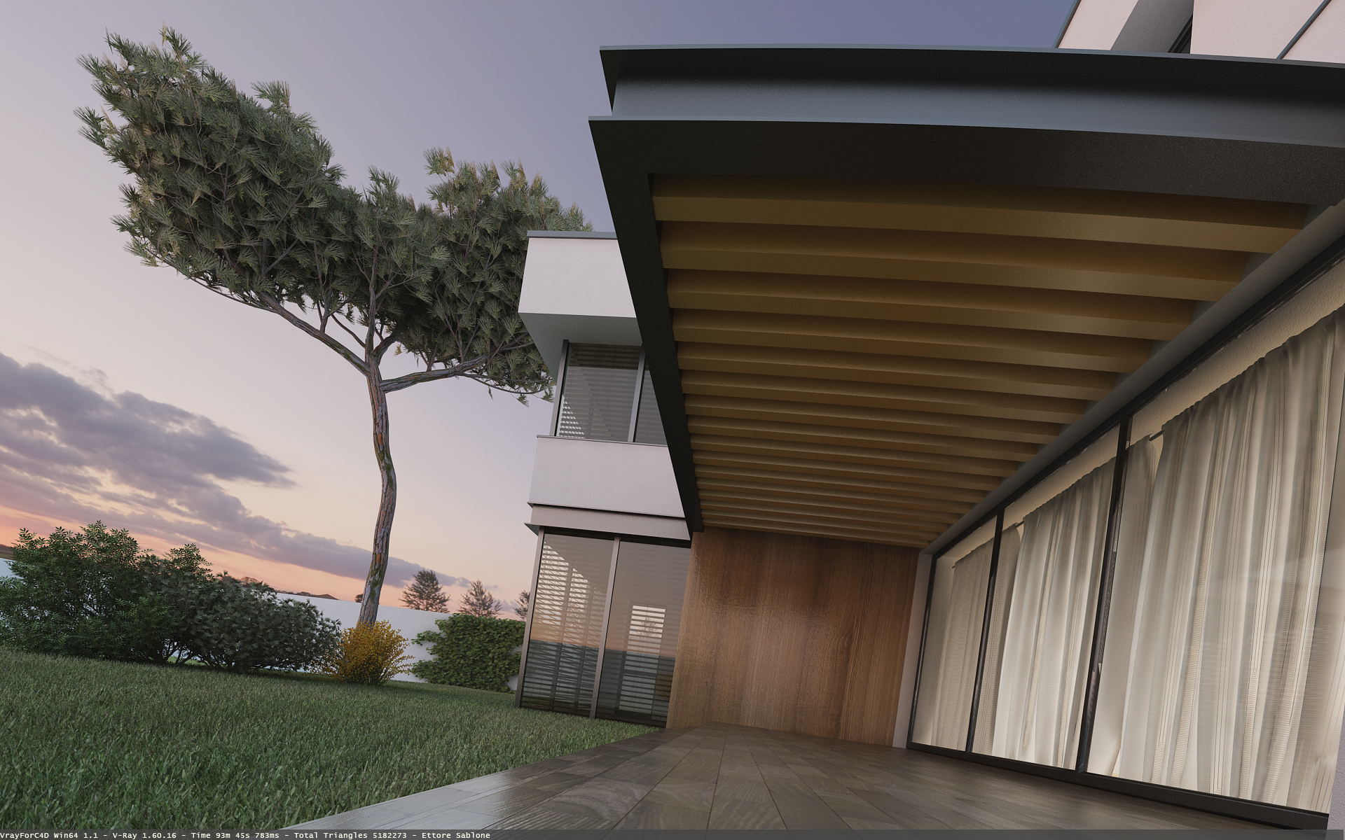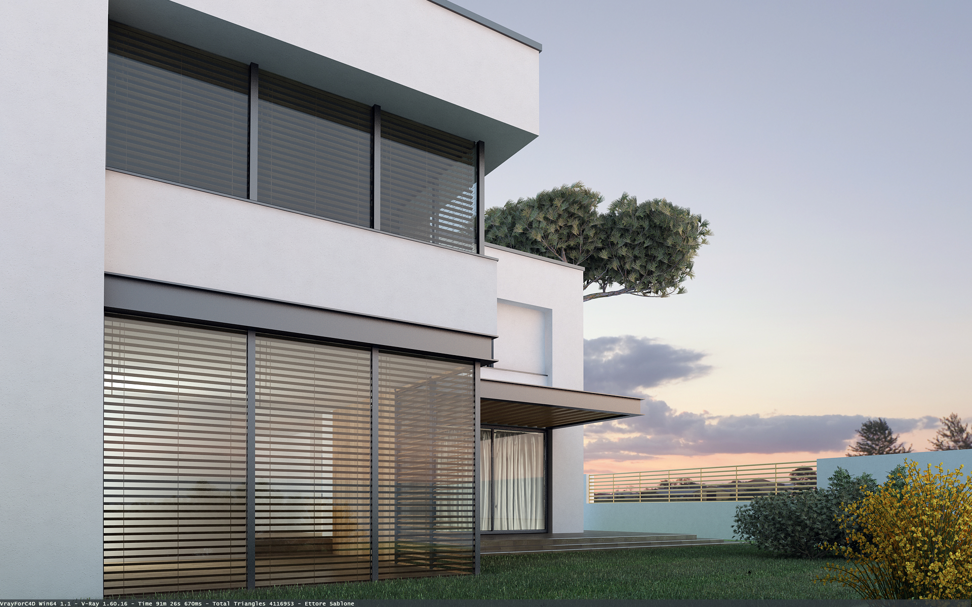 non male anche se ai livelli inferiori le vetrate danno l'idea di conficcarsi direttamente nel prato, il materiale della trave a sbalzo non è realistico quanto il resto, rivedrei anche il materiale dei travetti in ?legno? che l'attraversano, il muro sullo sfondo con il rampicante da l'impressione di essere lasciato senza materiale