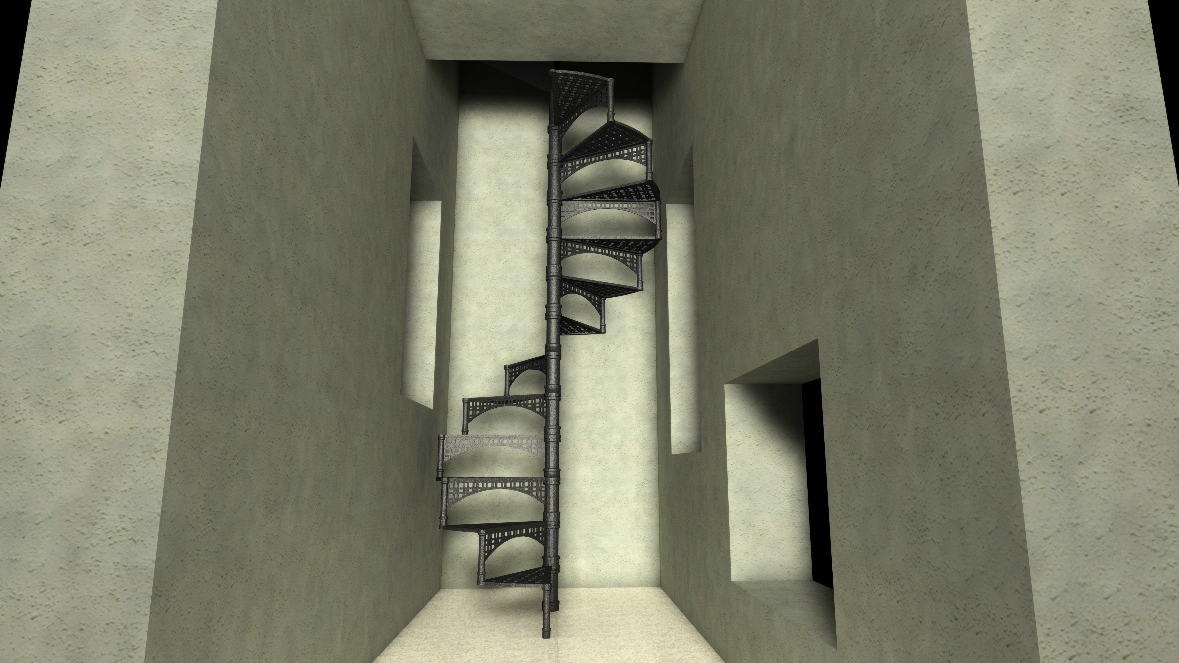 qui vi allego un renderin di una scala a chiocciola modellata in autocad e testurizzata con cinema 10. noterete che manca il parapetto che non è stato disegnato per prina cosa per mancanza di tempo e poi anche perchè non avrei saputo come realizzare il corrimano in piatto di ferro "spiralato"...