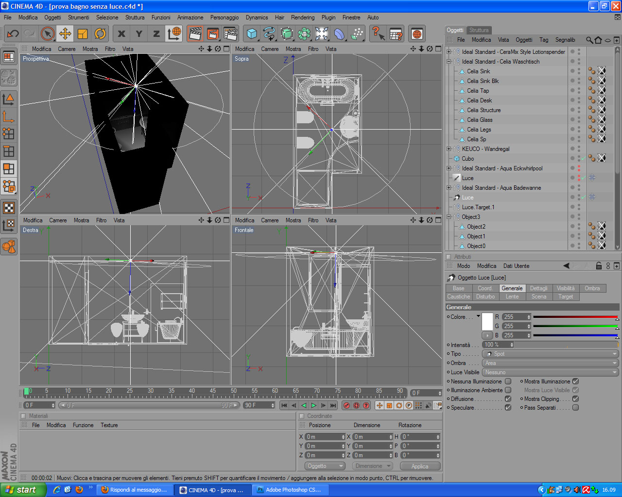 1- illuminazione: per illuminare ho utilizzato a) una luce infinita intensità 100% ombra area b) luce spot sempre intensità 100% ombra area entrambe posizionate al centro del bagno sul soffitto. Ho disattivato in opzioni nei parametri di rendering la luce automatica e ho attivato la illuminazione globale standard, intensità 150%, precisione 20%, profondità diffuzione 3.