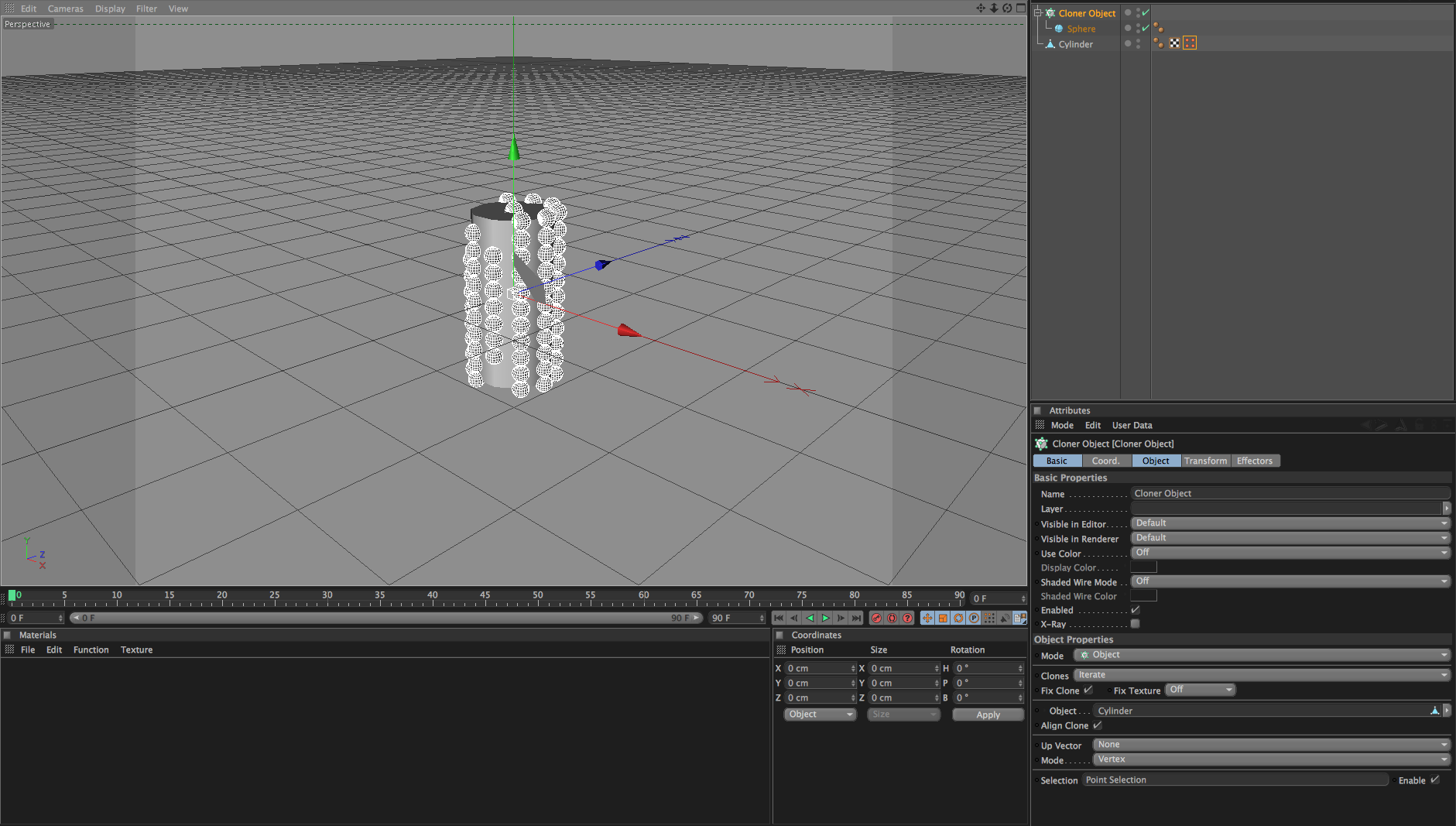Ho reso figlio dell'Oggetto clona una sfera che sarà clonata solo nei vertici della selezione poligoni dell'oggetto cilindro.