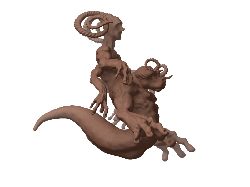Ciao Aggiungo l'ultimo nato.. :twisted: eheh.. in realtà Z-brush non é un programma di modellazione come normalmente inteso.. per questo va guardato completamente in un altra ottica..é un("IL") programma di scultura, ma non solo.. io sono un illustratore e ho lavorato già anke con plastilina argilla..per cui mi trovo bene a mettere volumi.. é il punto di contatto tra due mondi.. permette ai modellatori tradizionali di snellire la mole di lavoro.. collaborando con una figura complementare alle proprie competenze..
