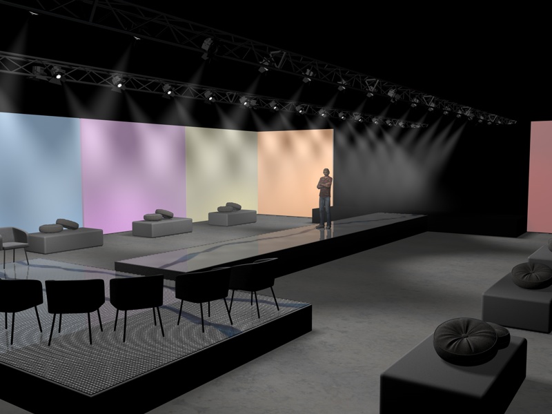 Ciao, secondo me non è vero che gli eventi come pure gli stand si svolgono sempre in ambiente bui! La chiave, sempre secondo me, è ricreare ciò che succede nella realtà, e cioé che c'é un'illuminazione diffusa del capannone o locale dove si monta lo stand e poi ci sono i punti luce propri dell'allestimento!