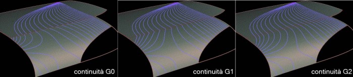 Con leggere ulteriori specifiche, questo modo di intendere la continuità vale anche per le superfici, solo che ci si ferma alla continuità G2 [fig.4], le linee che attraversano le superfici si chiamano Linee di Luce e la continuità delle superfici hal'ordine della continuità delle LdL. Le Linee di Luce [assieme alle Zebra Lines] sono rappresentative di un fenomeno che conosciamo sotto il nome di Riflessi.