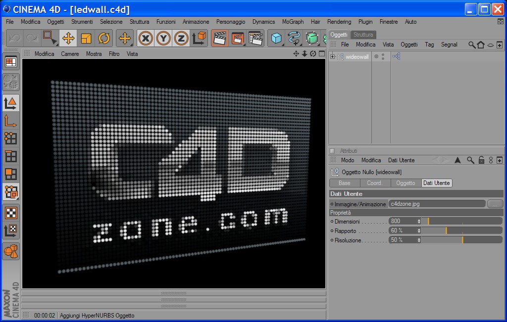 Se hai MoGraph puoi utilizzare un ledwall che ho creato tempo fa e che ti allego. E' parametrizzabile in alcuni componenti (dimensione, scala, risoluzione, immagine) e lo puoi utilizzare in 1000 modi diversi, basta solo un po' di fantasia.