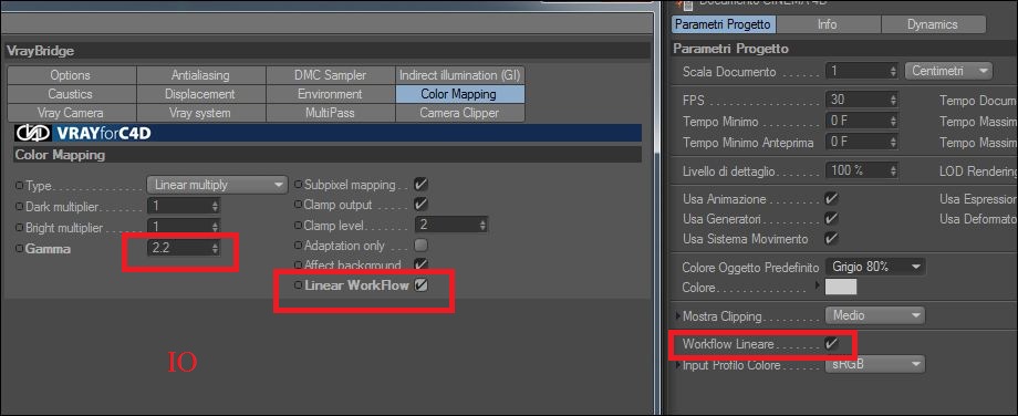 Il pulsante Workflow Lineare (di cinema) fa più o meno quello che fa il corrispondente in Vray, cioè applica agli input (a monte quindi) una correzione di gamma per poter calcolare il render in spazio lineare. Il dropdown Input Profilo Colore che c'è sotto rappresenta il profilo colore di default che viene assegnato agli input nel caso ne siano sprovvisti (tieni conto che quasi tutte le immagini digitali hanno il profilo sRGB).