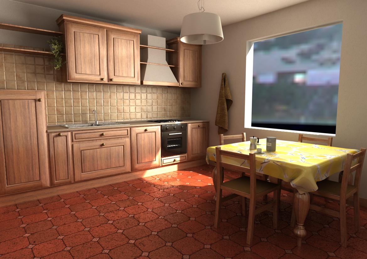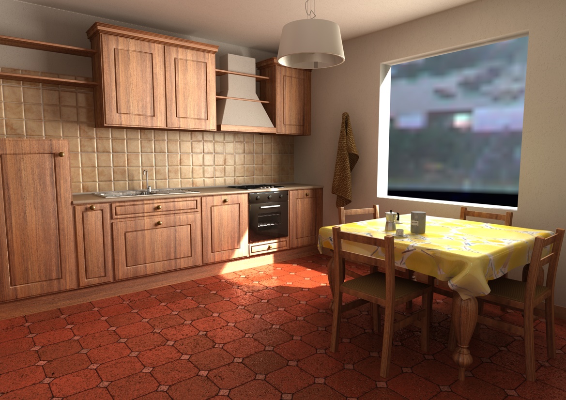 quoto entropy per quanto riguarda i suoi rilievi, inoltre sembra che anche le texture dei mobili della cucina siano sovradimensionate... la venatura sembra troppo grande. Inoltre, considerato che le ante sono composte da più pezzi, forse la venatura del legno dovrebbe avere orientamenti diversi a seconda che il pezzo sia orizzontale o verticale.
