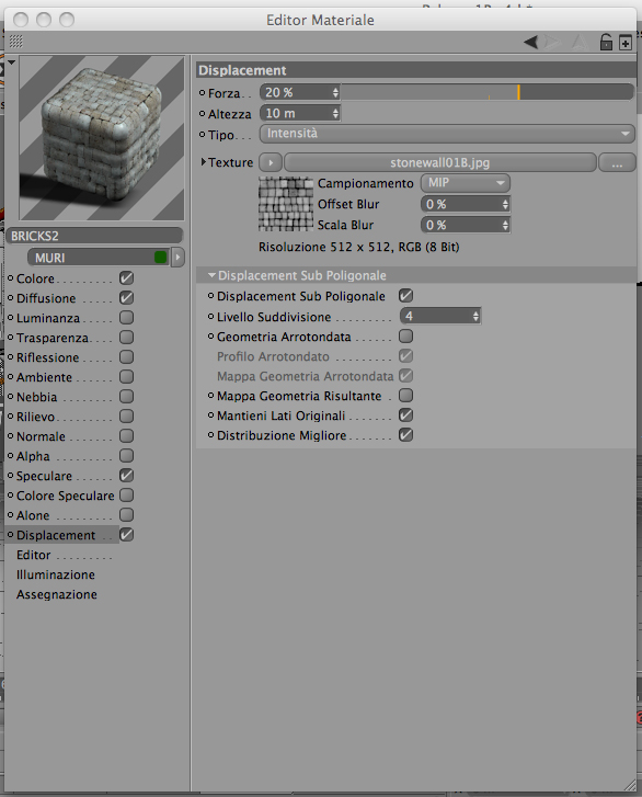 quoto giustamente quello che dice masterzonemasterzone ha scritto:scusate se mi intrometto diciamo che la cosa sta un po nel mezzo se nel displacement metti una tex in scala di grigi troppo particolareggiata cé il rischio che il displ. faccia troppi particolari e il mattone risulta con un effetto peloso e porcospinoso