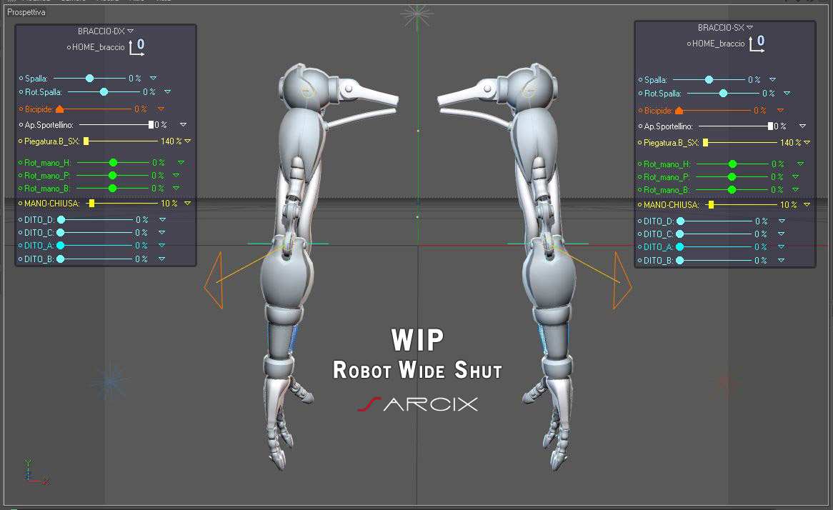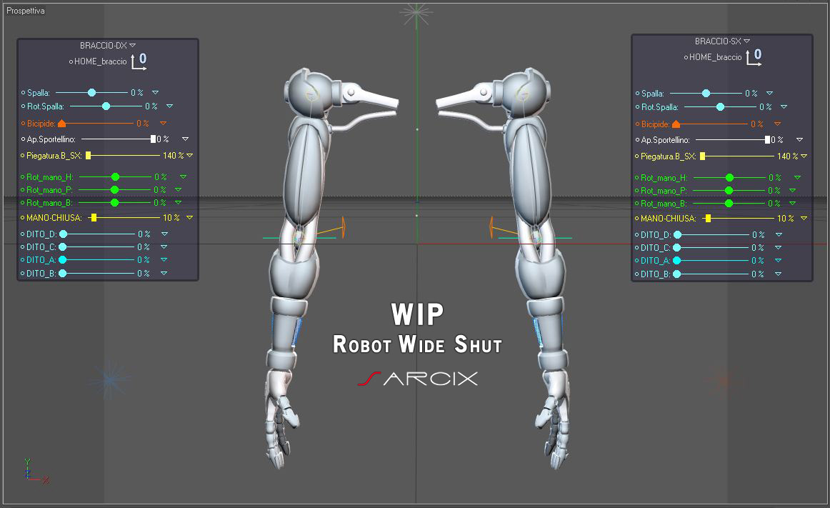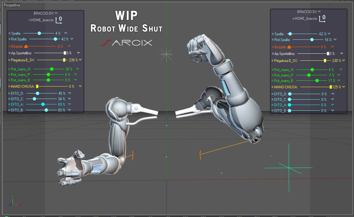 Smanettando sono anche riuscito ad ottenere una cosa che mi piaceva molto, cioè aggiungere dei pistoncini che simulassero i tendini della mano, in pratica se la mano si chiude o apre , essi ne seguono il movimento, stesso discorso per ogni singolo dito