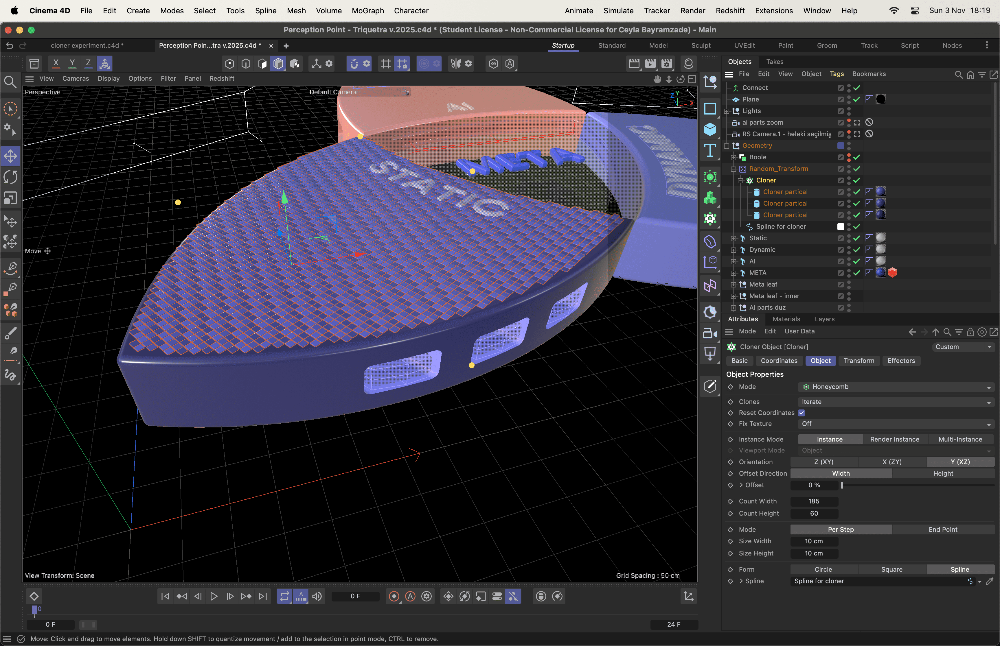 I've tried using the Cloner in Object mode, but it seems to distribute the pattern randomly. What I need is for the square pattern to wrap around all sides of the extruded spline in a uniform, seamless way. Any advice on how to achieve this?