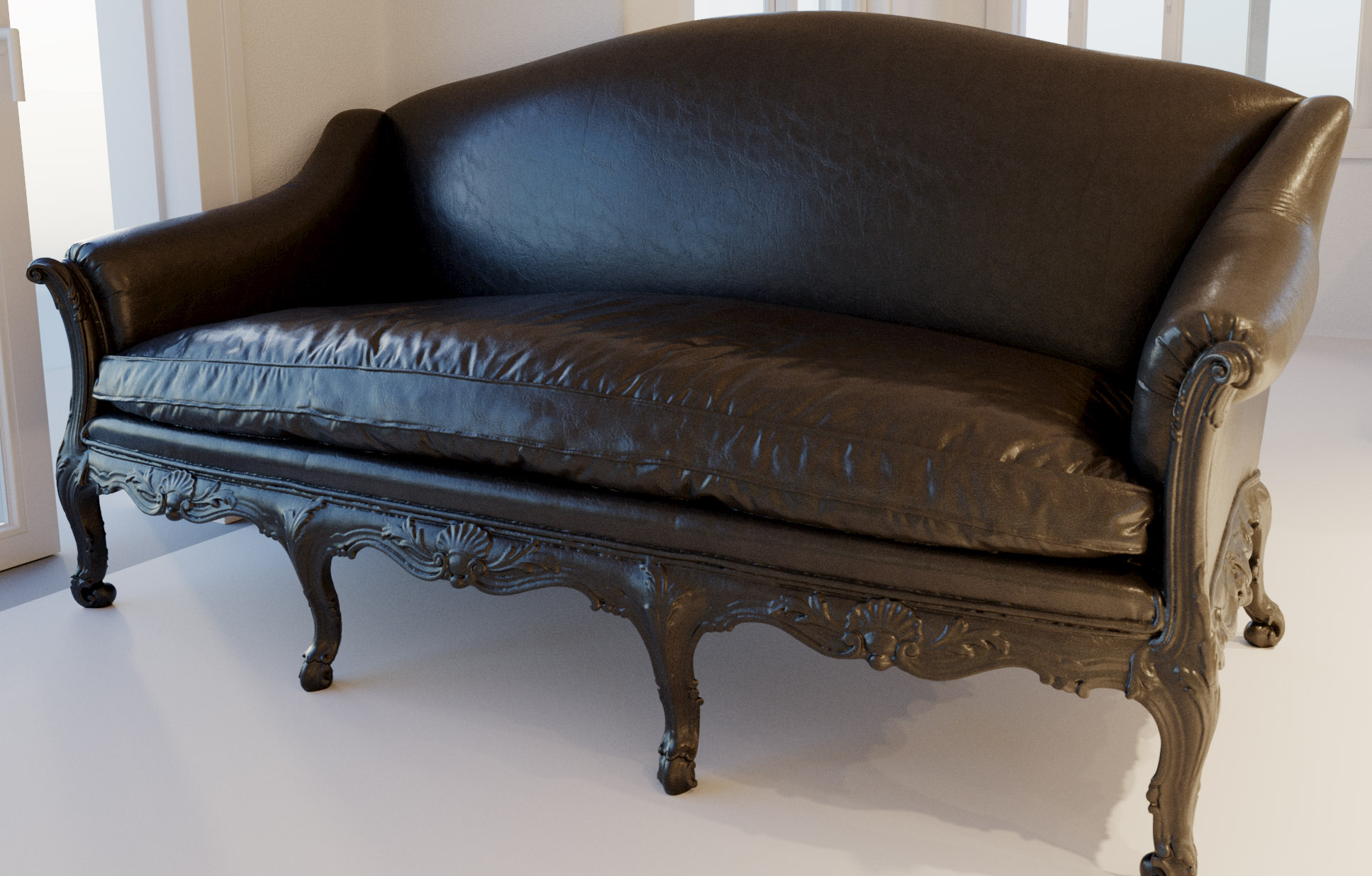 Torniamo ai materiali, sotto suggerimento di un'utente stamattina ho creato questa pelle all'anilina invecchiata, allego la poltrona di riferimento e il materiale applicato su un divano, in più un particolare dello shader calcolato sul mio set virtuale: