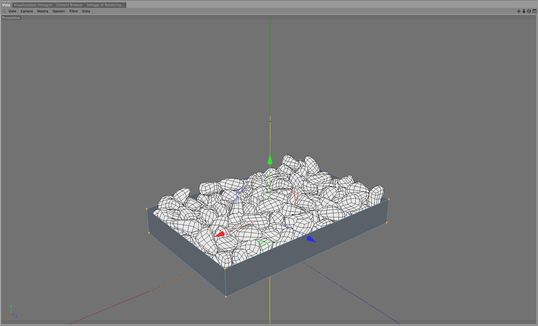 Devo realizzare una vasca composta da ciottoli (sassi). Per realizzarle ho creato un singolo sasso, utilizzando morgrah ho realizzare un oggetto schiera griglia e applicato al poligono del sasso un tacg "Crea corpo rigido".