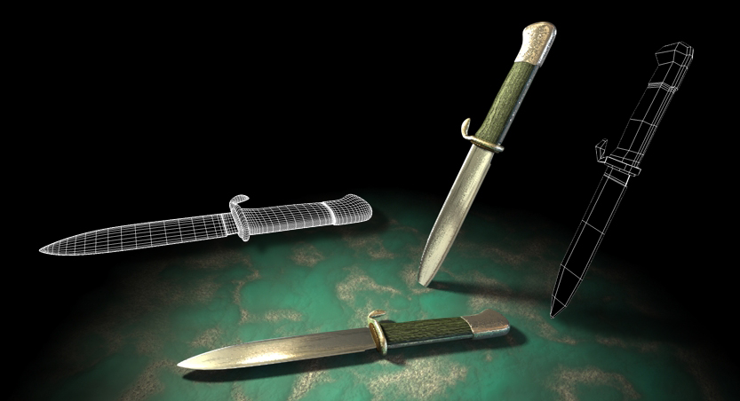 Ho, per ora, modellato il coltello; l'unica cosa che non mi convince è il materiale dell'elemento tra guardia e lama, ma non penso mi darà problemi trovare un'alternativa.