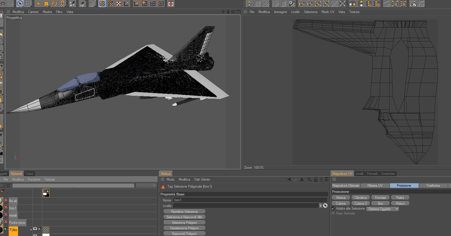 (per stendere la mappatura non ho fatto niente di che ,cioè ho selezionato tutto il tronco dell aereo ,ho fatto setta selezione ..poi ho aperto la mappatura uv e ho messo quella frontale.punto.