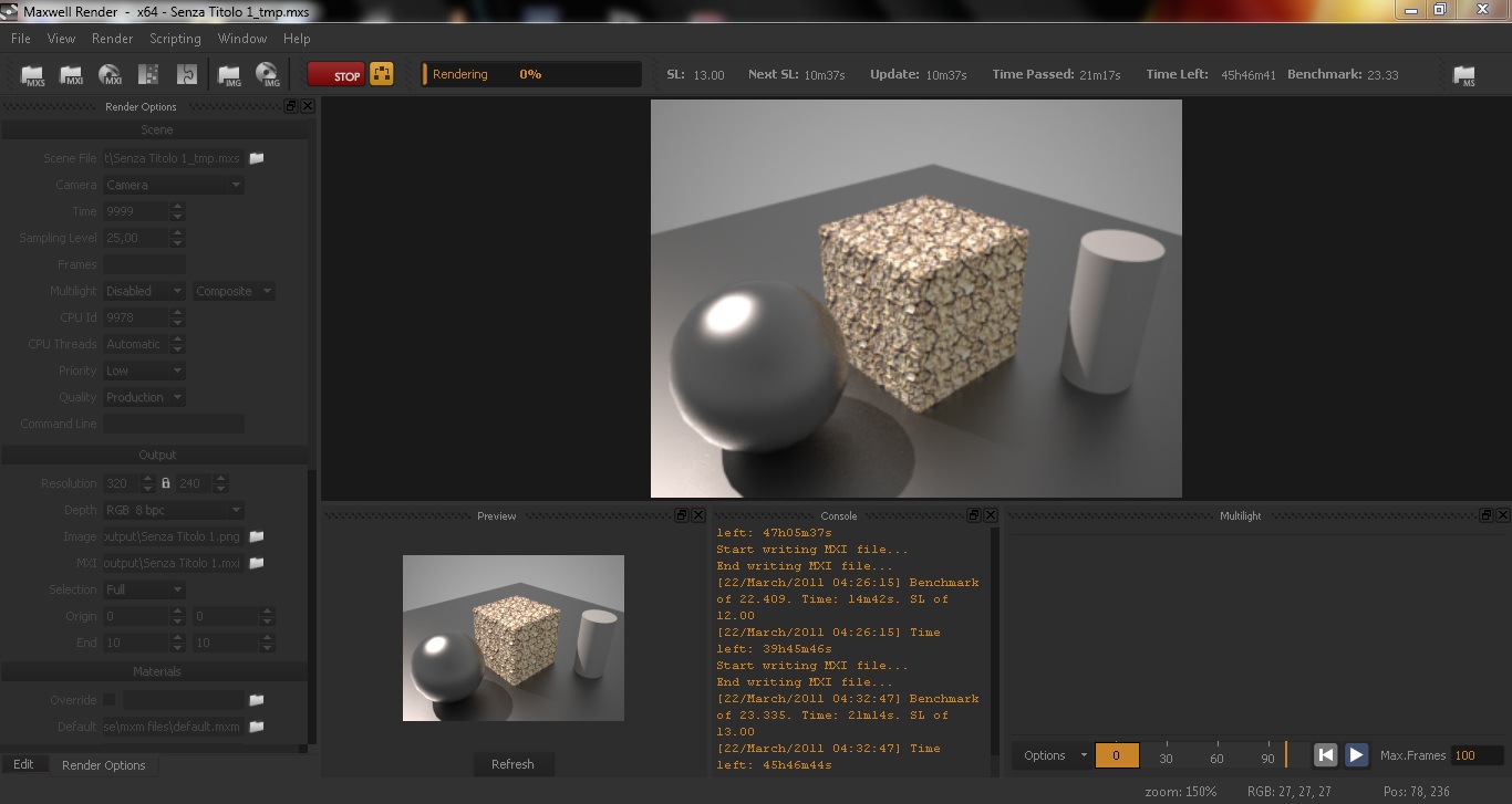 Purtroppo se non sono migliorabili questi tempi pur mantendo un ottima resa del rendering, mi trovo costretto a disinstallarlo subito e a non farci un minimo pensierino per un ipotetico acquisto. Davvero inaccettabili, in quanto troppo ma troppo elevati. Caspita stiamo parlando di 3 supersemplicissimi oggetti senza nessuna modifica. Ho ricontrollato il render mentre scrivevo ed è arrivato asolo 1%