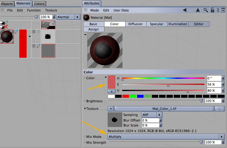 Quando aggiungi un layer colore al materiale, quello diventa il suo colore, è come se caricassi un'immagine (cioè in realtà è proprio così, se torni indietro al materiale vedrai che ha assegnato nel campo texture del colore una nuova immagine che si chiama tipo Mat1_color.tif, che è quella che crei tu a 0:48"). Hai quindi due strade: crei un layer del colore base che vuoi, ne crei un altro sopra e ci disegni il pallino, oppure dall'editor dei materiali nel canale colore scegli un metodo di fusione che permetta al colore che hai impostato di miscelarsi con il mat1_color.tif caricato come texture.
