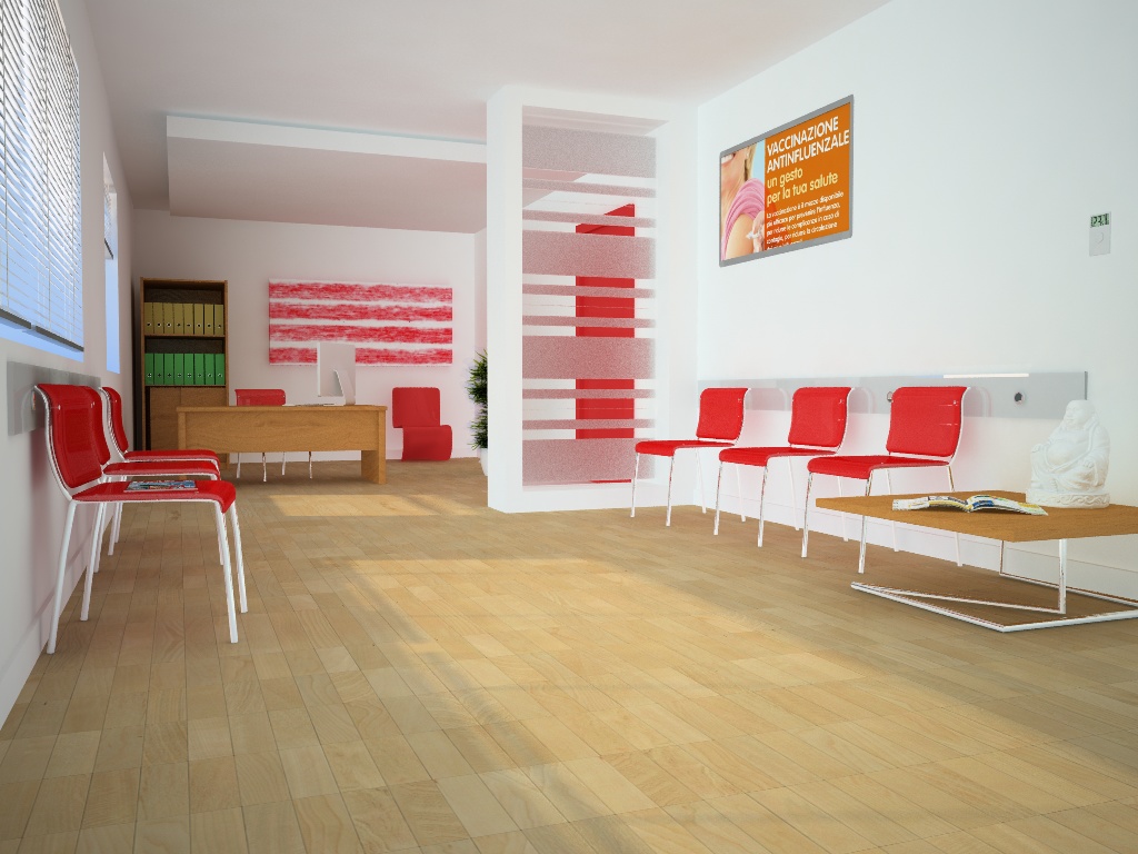 ok, ho sistemato un po di cosette, aumentato l' illuminazione e virata su un colore neutro (era troppo giallastra...concedetemi il termine). Ridotto il calibro dei faldoni, inserito una rivista (Focus) sulla sedia in primo piano e rimosso le luci che venivano dal controsoffitto.