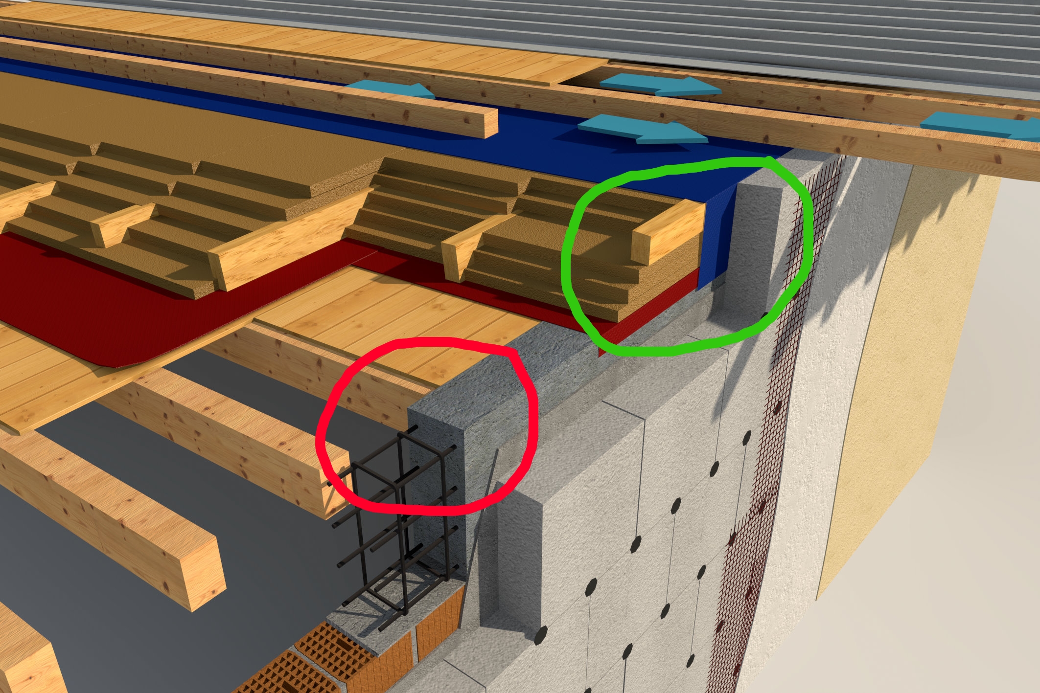 la trave in calcestruzzo porta i travetti interni, sono quelli che vedi normalmente in una casa con tetto in legno, e invece che proseguire si fermano. fuori dalla trave in cls c'è il cappotto che si unisce all'isolante sulla copertura, per questo non esiste il ponte termico.